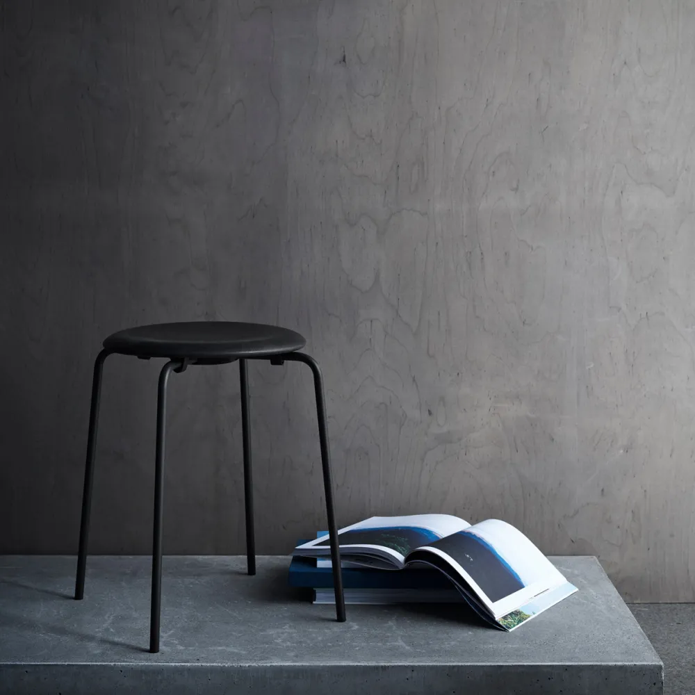 Enkel og tidløs skammel, som er moderne, minimalistisk og ren i sit udtryk. Skamlen er yderst oplagt som værende en enkel siddeplads, der både kan benyttes i det daglige eller fungere som ekstra stol i boligindretningen. Sædet er beklædt med det fineste sorte læder, alt imens stellet er pulverlakeret.
