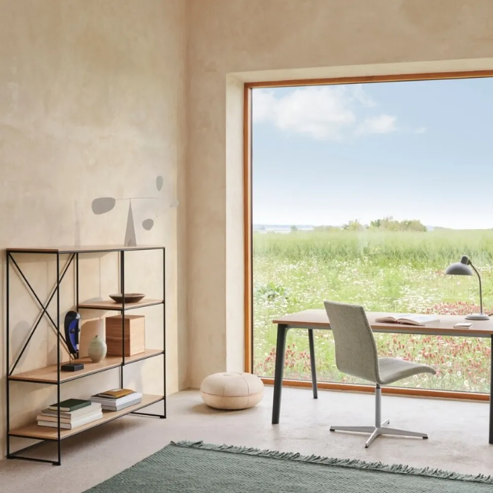 Enkelt og elegant reol fra Fritz Hansen, som er produceret i pulverlakeret stål med en mat overflade, samt let afrundet og håndsvejset samlinger. Dette bevirker, at reolen fremstår mere blød og indbydende, hvilket hylderne i natureg understøtter. De diagonale pinde er foruden det dekorative element fremstillet som en ekstra støtte til reolen.