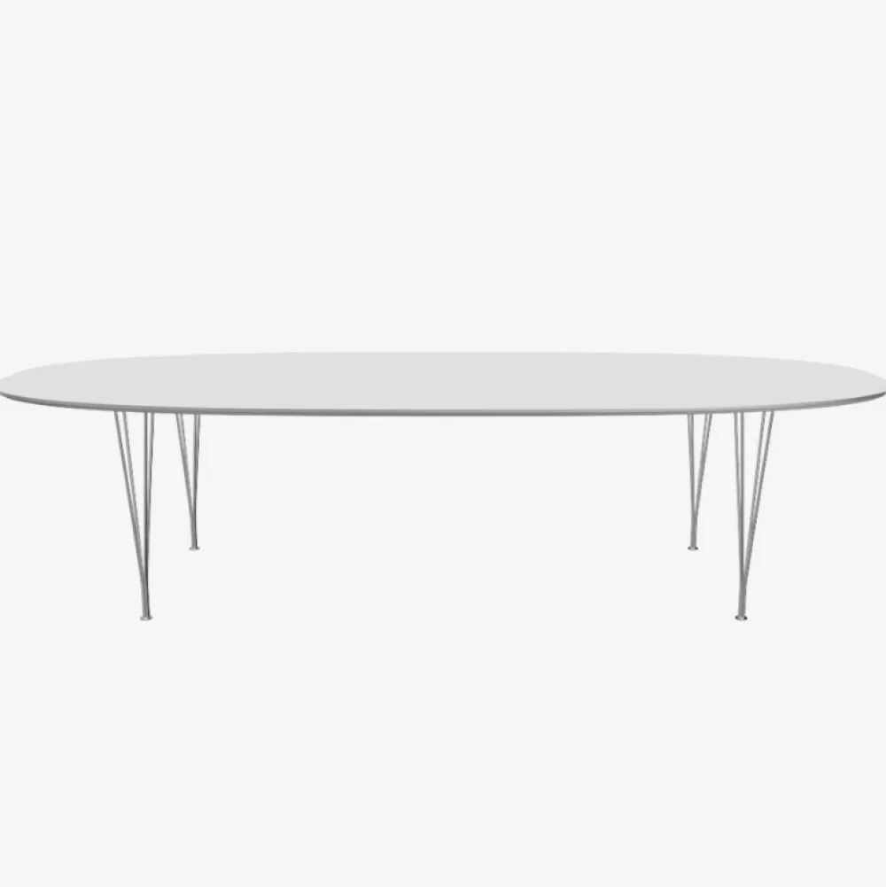 Super-Ellipse bordet har en plade i enten laminat eller valnød og spændben i forskellige udgaver. I Fenix laminat er bordpladen med nano-tech overflade, der ikke ændrer farve over tid, er hygiejnisk og varmeresistent samt anti-fingeraftryk. Bordpladen har en matpoleret aluminiumskant, der gør bordet ekstra slidstærkt.