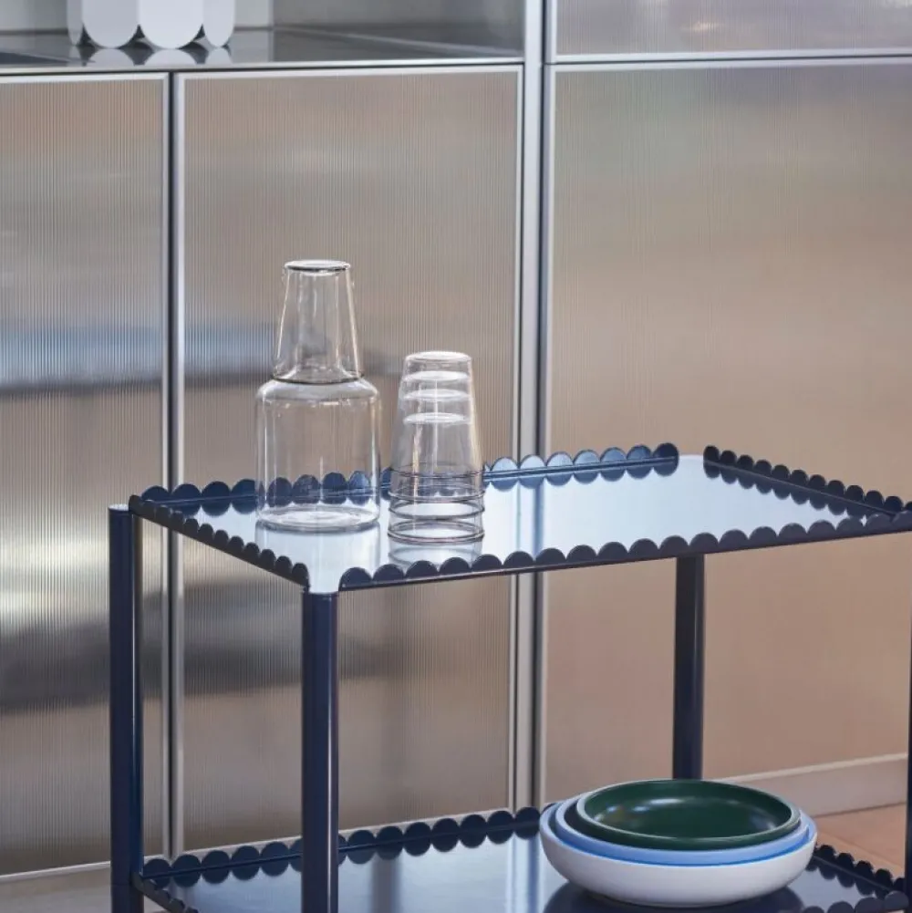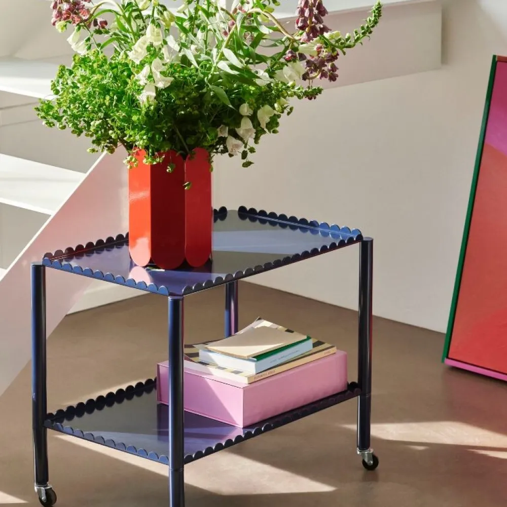 Arcs Trolley er designet af den belgiske duo Muller Van Severen og er en funktionel og dekorativ trolley indkapslet i en samlet kæde af lodrette buer. Den elegante, udformede ramme understøtter to eller tre etager med slanke ben monteret på hjul for nem manøvrering.