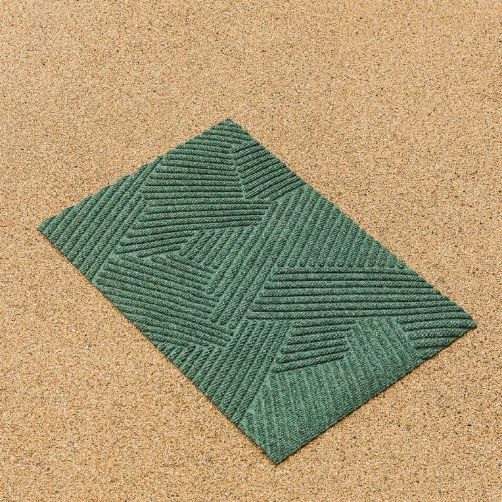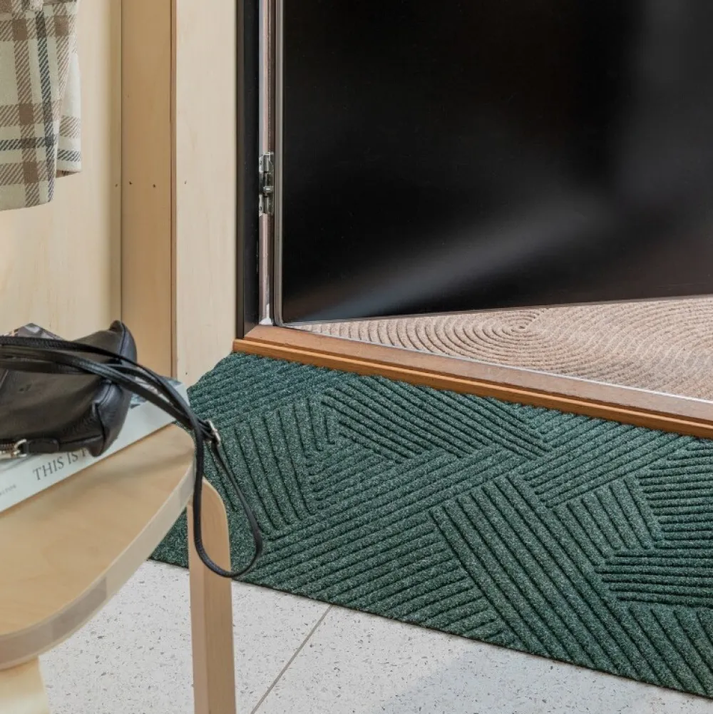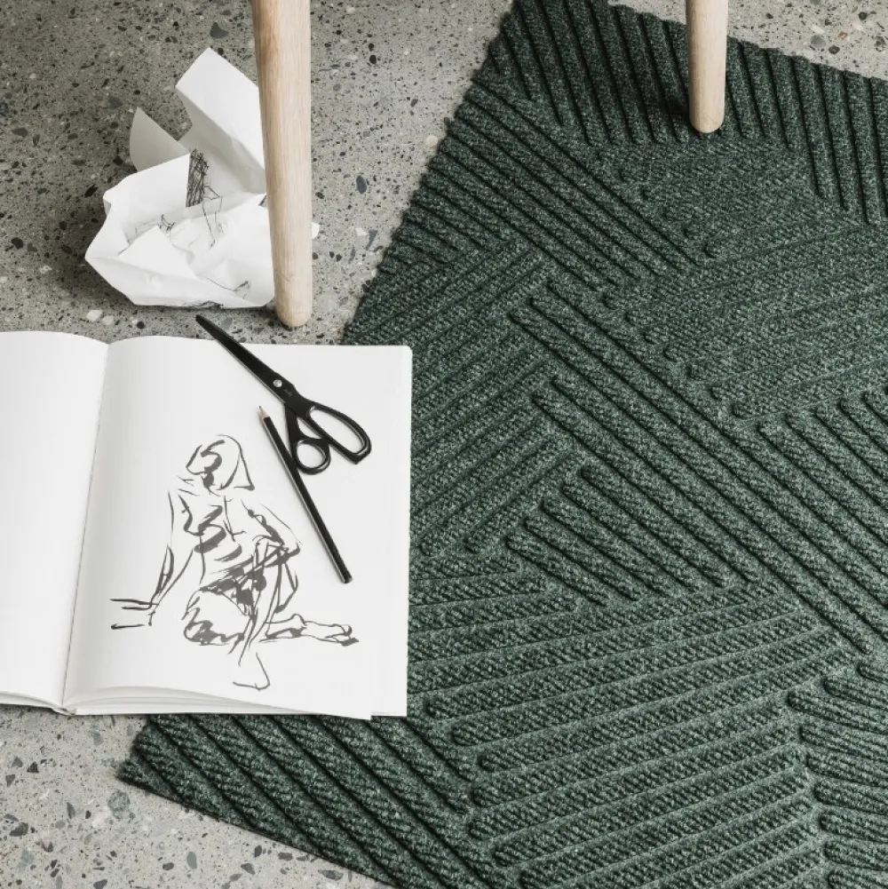 Funktionel og farvefin måtte, der er udført i et minimalistisk design. Måtten er inspireret af græs, der svajer i en varm sommerbrise, hvilket på fineste vis illustreres af et blødt, geometrisk design i en dyb grøn farvenuance. Det tredimensionelle mønster er taktilt og meditativt, hvorfor der skabes en rolig atmosfære ved dørtrinnet. Måtten er designet med en ru overflade og en gummieret bagside, hvorfor den er velegnet til både inden- og udendørs brug.
