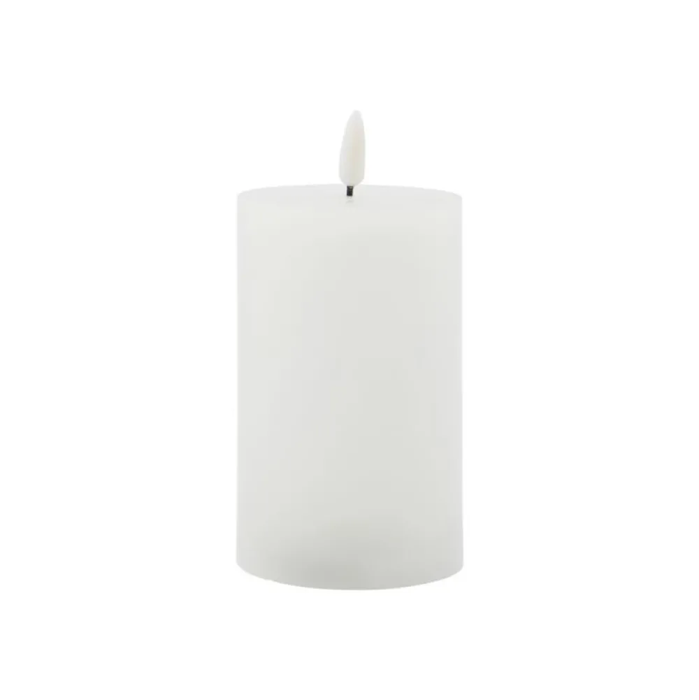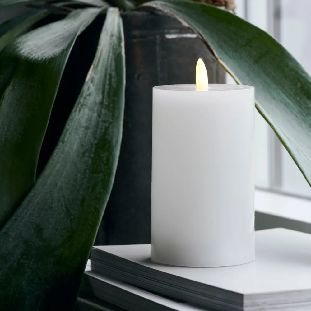Dette hvide, mellemstore LED-bloklys er et smukt alternativ til stearinlys. Såfremt man ønsker at nyde sine lanterner uden varme, røg og levende lys, så er dette LED-lys helt ideelt. Lyset er en god løsning for børnefamilier, idet den ligner ægte lys med voksoverflade og en varm glimrende glød. Såfremt man blive distraheret og glemmer at slukke lyset, slukkes det automatisk efter fem timer.