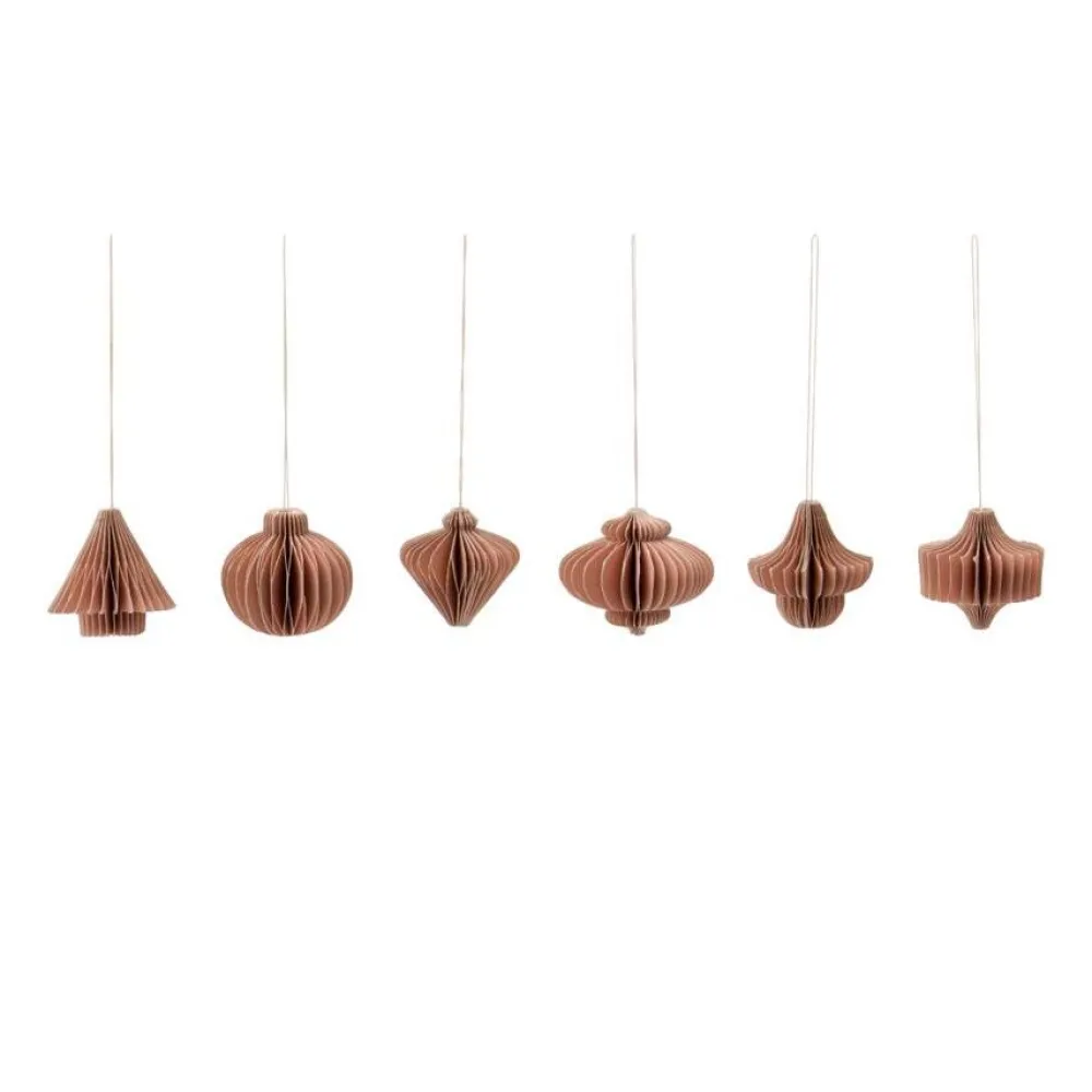 Yndigt papirpynt i seks forskellige designs, der tilfører variation i juleindretningen. Qua kombinationen af farvenuancen og de vintage-inspirerede designs fuldendes træet med et nedtonet og elegant strejf. Papirornamenterne er ideelle at kombinere med andre julepynt for at skabe et unikt udtryk – uanset om det er på juletræet eller en gren.