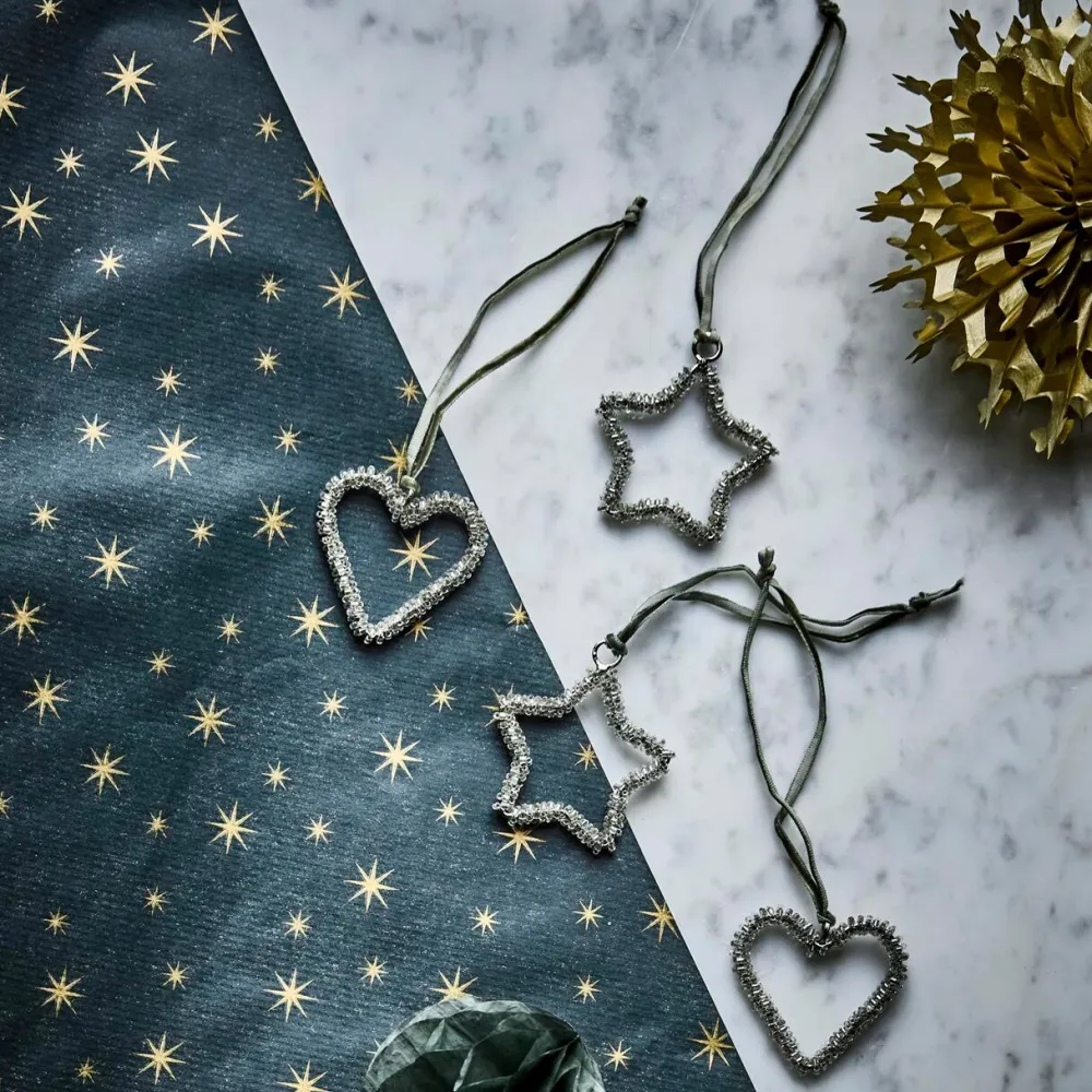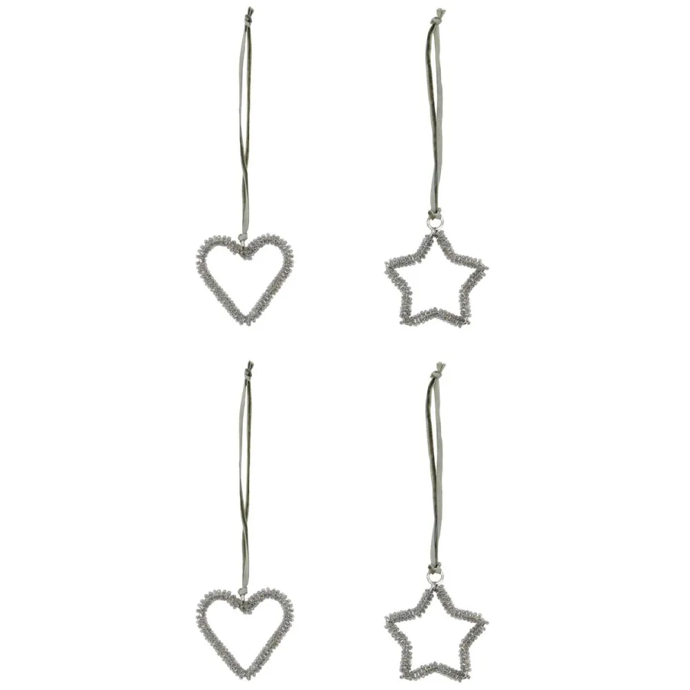 Udsøgte juleornamenter i stjerne- og hjerteformer, der tilfører juledekorationen et strejf af elegance og festlig glans. Fremstillet af jern og prydet med glitrende sølvperler, reflekterer de lyset smukt og skaber en magisk julestemning i hjemmet. Sættet består af fire unikke ornamenter, som let kan hænges med bløde velourbånd. De er ideelle på juletræet, i grene eller som del af et stilfuldt bordarrangement. Kombinationen af robust materiale og delikate detaljer giver et tidløst og raffineret udtryk. Et dekorativt sæt, der bringer varme, glans og festlig elegance til julens indretning.