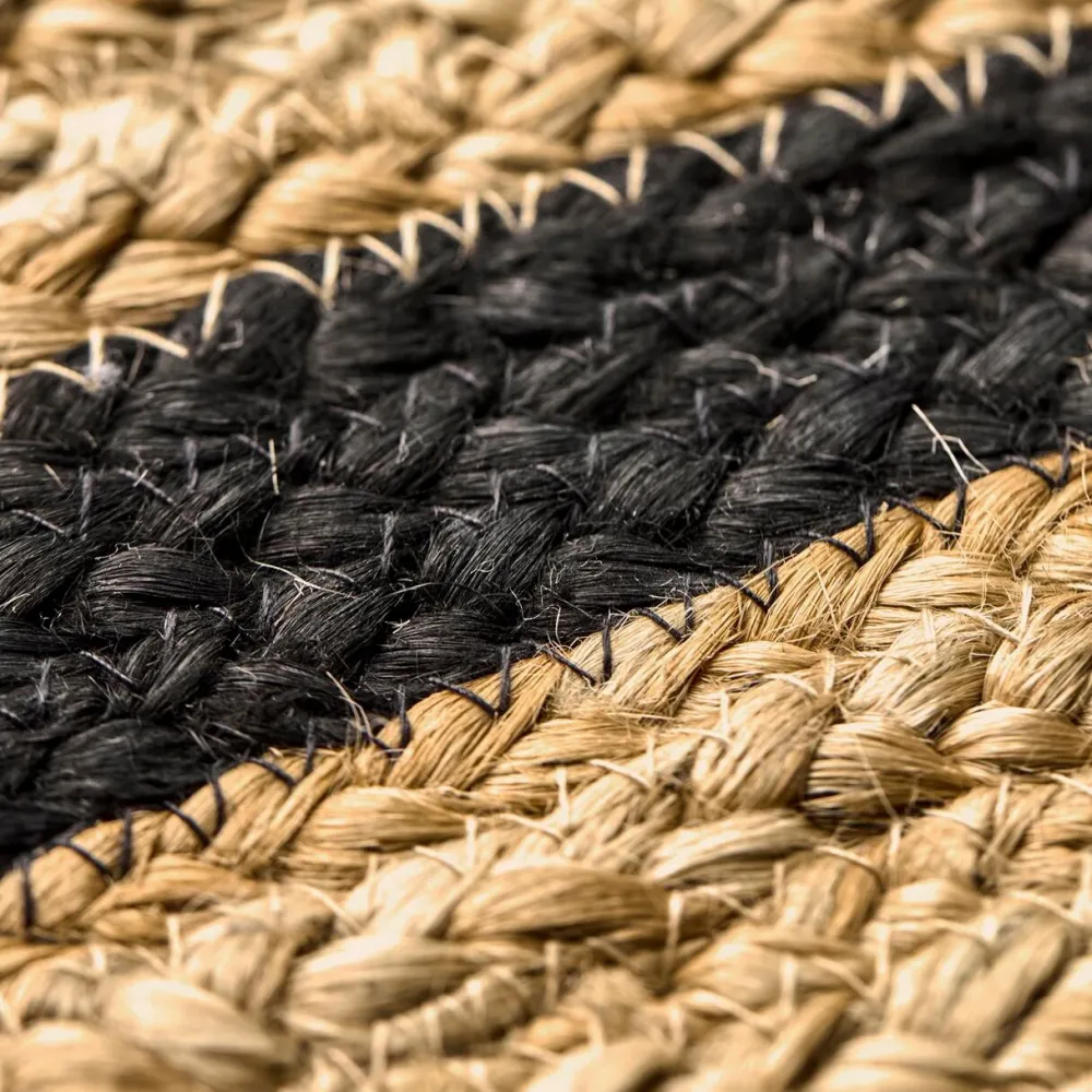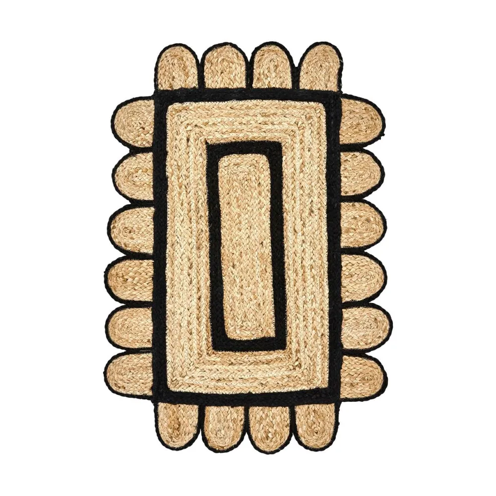 Yndefuld dørmåtte, der er håndlavet med omhu. Dørmåtten er udført med et slående grafisk mønster i naturlige og sorte nuancer. Designet er charmerende og de buede kanter tilfører glæde og positivitet til boligindretningen. Uanset om den placeres i entréen, på badeværelset, ved terrassedøren eller i soveværelset, bliver den et indbydende element i hjemmet.