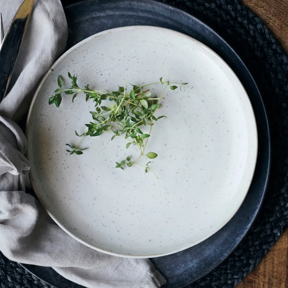 Enkel og yndig tallerken, som grundet sin størrelse er særdeles velegnet til frokost eller mindre aftensmåltider. Tallerkenen er lavet af porcelæn og udført i et enkelt og uformelt look. Som følge af glaseringens lyse, neutrale nuancer og plettede struktur er den smuk at kombinere med de tilhørende elementer fra Pion-stellet eller mønstrede skåle, for herved at skabe et unikt og finurligt touch.