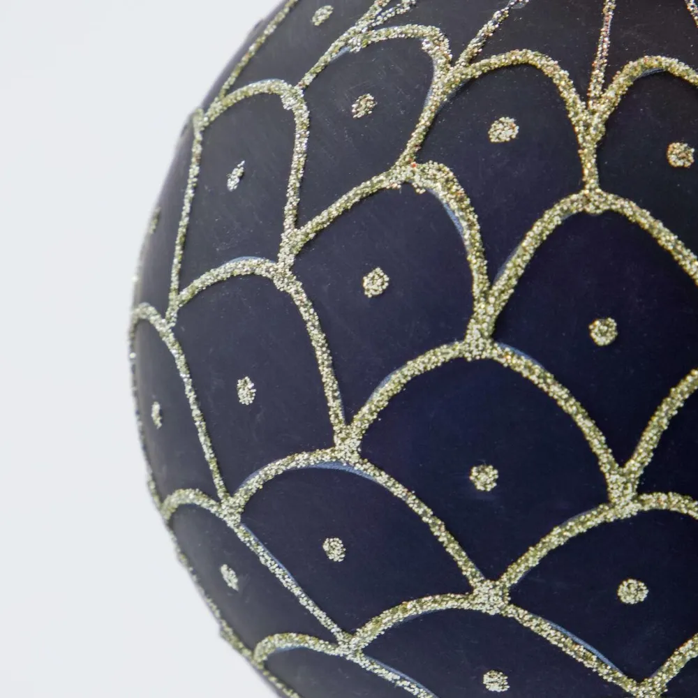 Fin og elegant julekugle, der bibringer et umiskendeligt vintagepræg. Julekuglen er udført med et klassisk mønster i sølvglitter, der på fineste vis fuldender designet. Kombiner julekuglen med andre i tilsvarende farvenuancer for at opnå en nostalgisk stemning, eller bland den med andre farver, for et personligt udtryk.