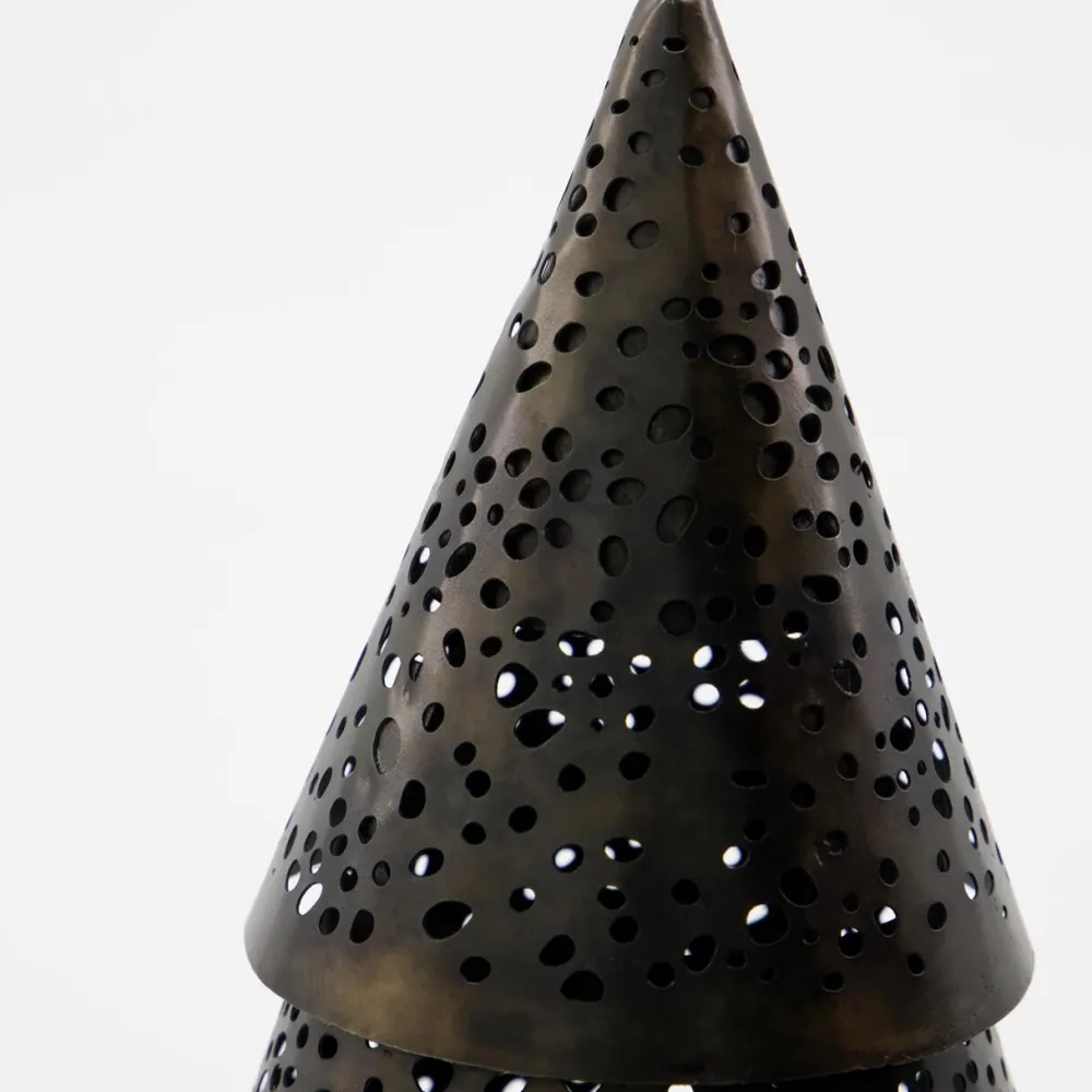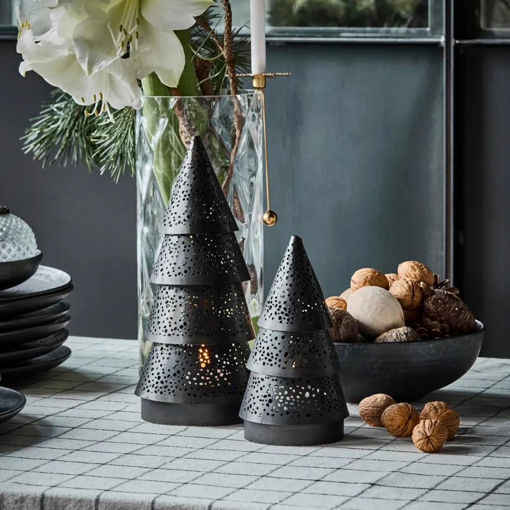 Håndlavede juletræer, der skaber en varm og stemningsfuld jul. Den fine farvenuance og det yndige, perforerede mønster lader lyset skinne igennem og spreder et indbydende og hyggeligt skær i rummet. Træernes aftagelige top giver mulighed for at placere lys indeni, hvilket fremhæver det dekorative mønster og skaber en magisk atmosfære. Et elegant og tidløst sæt, der er ideelt på middagsbordet, i vindueskarmen eller på reolen – og som bringer varme, glød og julestemning ind i hjemmet.