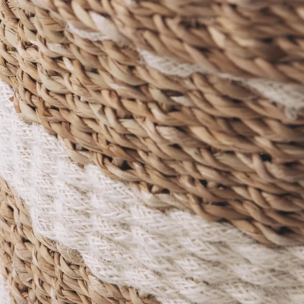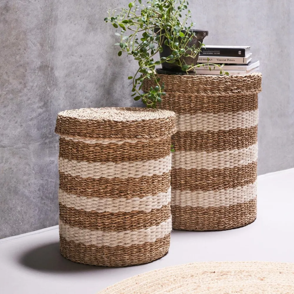 Dekorative opbevaringskurve, der forener funktionel opbevaring og afslappende detaljer. Hold orden på tæpper, vasketøj eller andre genstande og gem dem væk med dette sæt bestående af to kurve, der er lavet af søgræs. Rummet kommer til at se roligt og ryddeligt ud, og de hvide striber tilfører fine detaljer til indretningen. Placer opbevaringskurvene i et hjørne af stuen, eller benyt dem som vasketøjskurve på badeværelset. De er et skønt alternativ til opbevaringskasser – særligt hvis der mangles skabsplads.