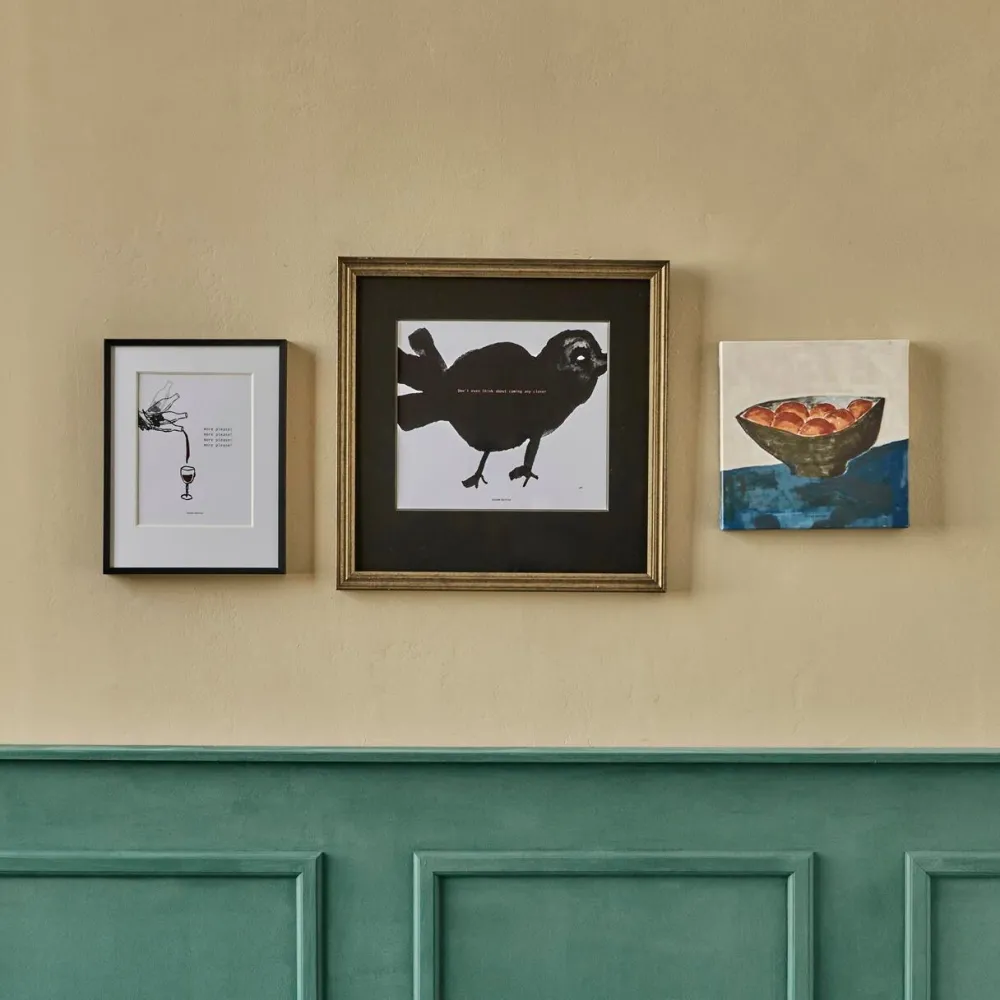 Charmerende vægkunst, der sætter et legende præg på indretningen. Med en finurlig afbildning af et rødvinsglas, der fyldes, ledsaget af en humoristisk tekst, bringer værket både stil og smil frem. Kunstværket er elegant udstillet på papir, indkapslet i en elegant sort aluminiumsramme med glasdæksel og fremhævet af en hvid passepartout.