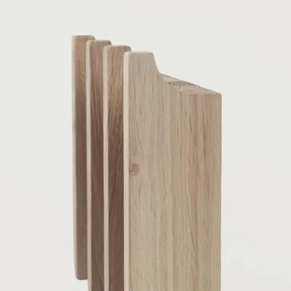 Moderne og elegant knagerække, som er både praktisk og yderst dekorativ. Inspirationen for designet er koniske søjler, og knagerækken kan med sin pladsbesparende størrelse anvendes i såvel entré som badeværelse, køkken og soveværelse. Knagerækken er fremstillet i det smukkeste egetræ og er designet med 4 knager til ophæng. Såfremt flere knager er nødvendige, kan flere knagerækker tilføjes og sættes i forlængelse af hinanden.