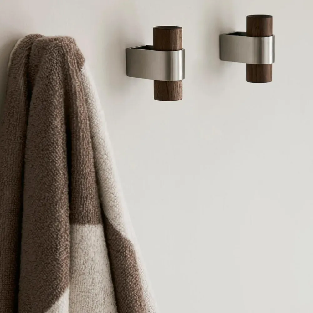 Stilrene knager, der på fineste vis kombinerer valnøddedetaljer med krogen i rustfrit stål. De kontrasterende materialer tilføjer et stærkt stilpræg til enhver overflade.