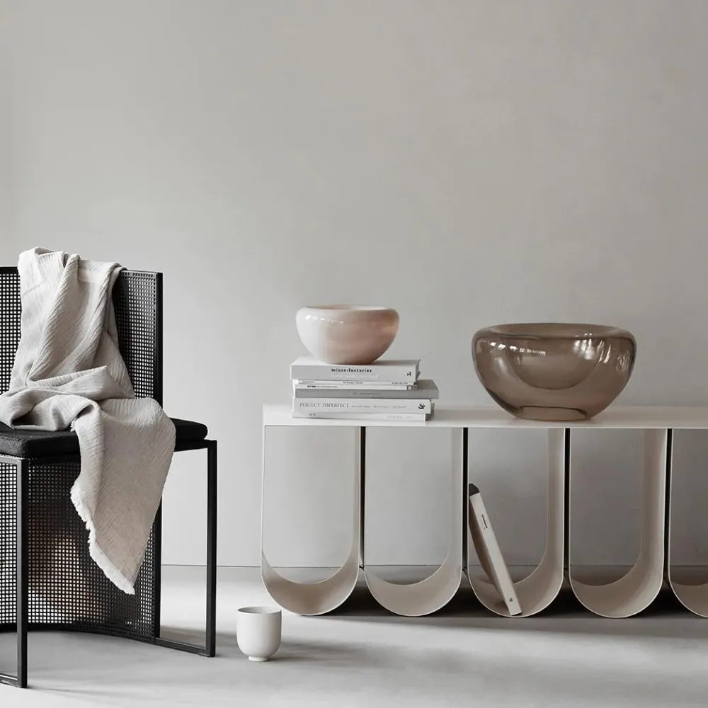Farvefin og mundblæst skål med en blød og minimalistisk silhuet. Glasskålen er et iøjnefaldende stykke glaskunst, idet den både er skulpturel og funktionel. Designet er enkelt og demonstrerer med al tydelighed at form og funktion kan kombineres. Det bløde buede formsprog tilfører skålen et retro-designer look.
