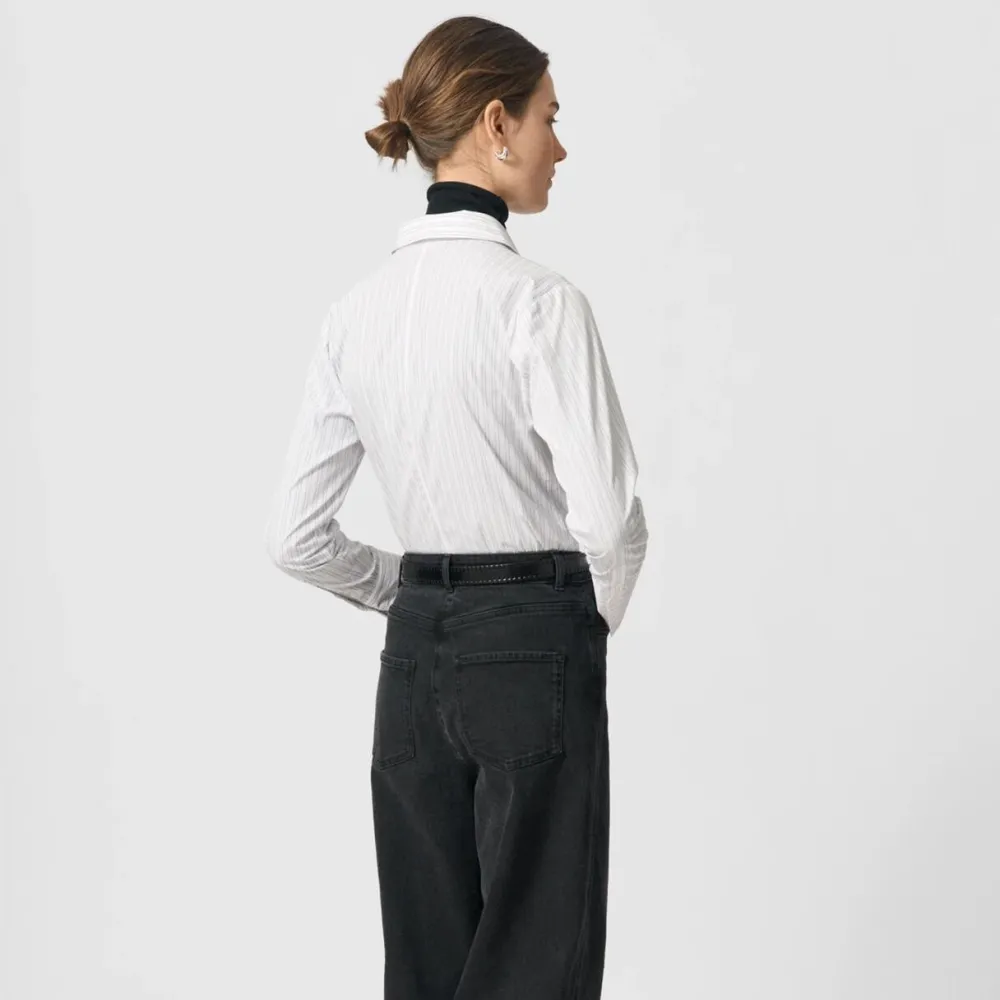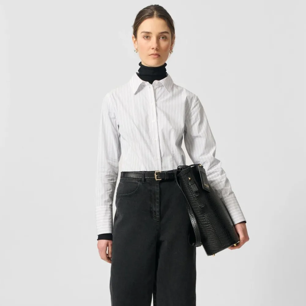 Feminin og kropsnær skjorte, der smukt eksemplificerer, hvorledes klassisk skrædderi kan få nyt liv. Den kropsnære pasform og indsnitsdetaljerne fremhæver silhuetten med raffineret lethed, mens det nålestribede bomuld tilfører et sofistikeret, men tidløst udtryk. De høje manchetter og den klassiske krave tilføjer kant og karakter, hvorfor den er ideel til kvinden, der værdsætter underspillet elegance med personlighed.