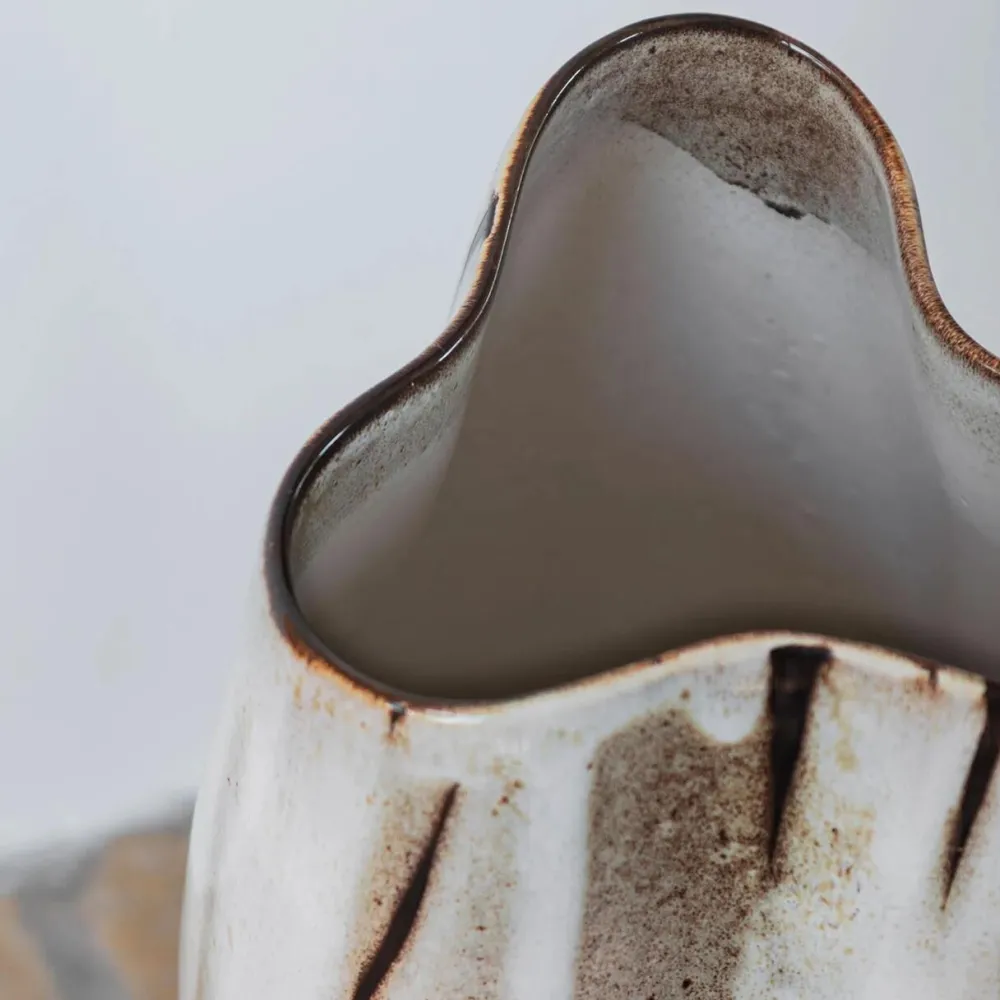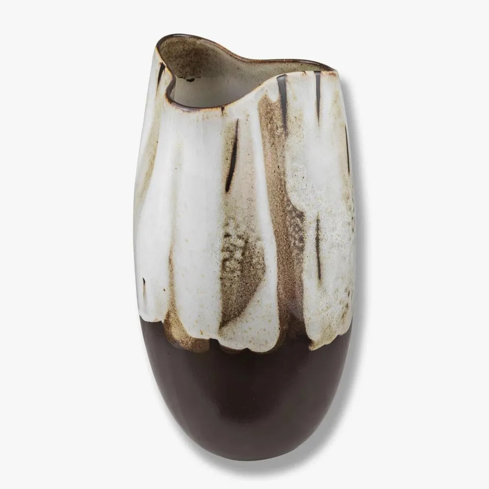 Æstetisk og formfuldendt vase, der forener moderne design med klassisk håndværk. Den organiske, asymmetriske form skaber et legende og dynamisk udtryk, mens kontrasten mellem den semimatte mørkebrune bund og den blanke off-white glasur giver et smukt visuelt spil. Glasuren flyder ned over vasens overflade og danner bløde overgange i varme lysebrune nuancer, hvorfor hver vase fremstår som et unikt kunstværk. Vasen fungerer både som statement piece i al sin enkelthed, eller som en elegant ramme om blomster og grene, der fremhæver dens organiske form og unikke glasue