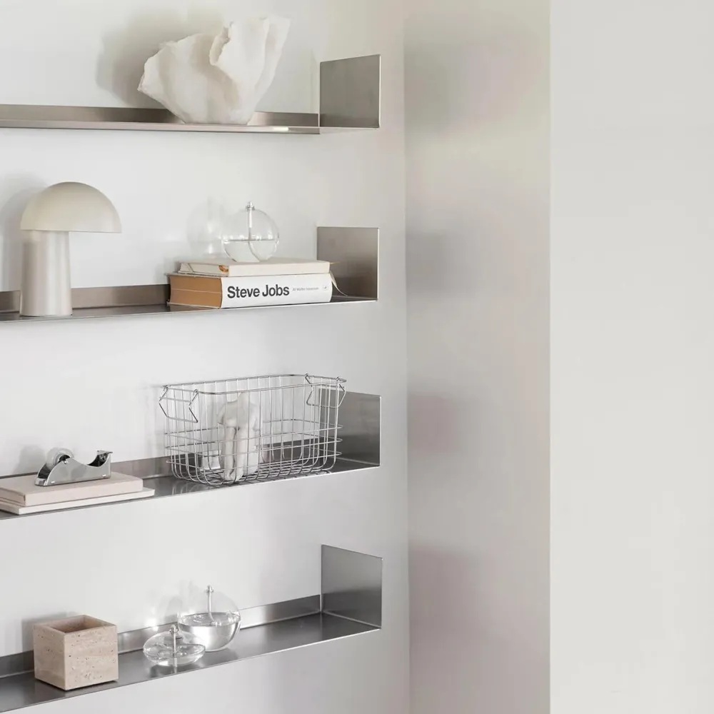 Stilren og vægtmonteret hylde, der kombinerer rene, rå linjer med et let og svævende udtryk. De subtile spil i stålets overflade tilfører et moderne og industrielt præg. Hylden er elegant i udtrykket, men robust i sin konstruktion, hvorfor den er ideel i ethvert rum, hvor kombinationen af funktion og æstetik ønskes. Hylden står smukt alene, men kan tilmed kombineres i flere niveauer for et markant og dynamisk udtryk.