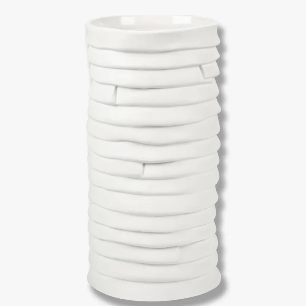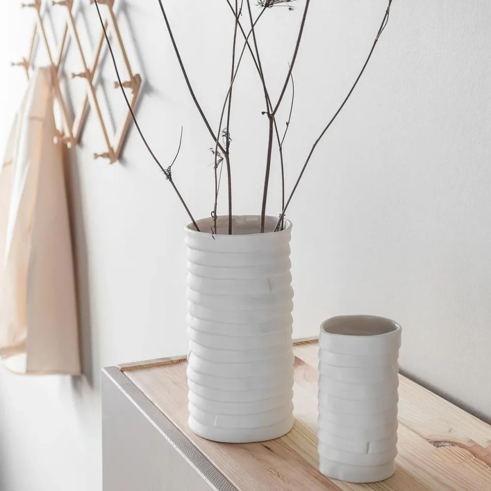 Enkel og detaljeret vase, der udspringer af Mette Ditmer’s originale, håndformede keramik. Det oprindelige værk er skabt af flere bånd af ler, som nænsomt sammensættes til én form, der balancerer det enkle og kunstneriske i et udtryk. Vasens år, matte yderside afslører sporene af det menneskelige touch – diskrete fingeraftryk, der vidner om håndværk og nærvær; i fin kontrast til den glatte, blankglaserede inderside. Vasen er ideel til sæsonens blomster – fra forårets spirende stilke til vinterens grønne grene og gran. Vasen står i al sin enkelthed smukt, idet den tilfører et strejf af ro, æstetik og natur til hjemmet.