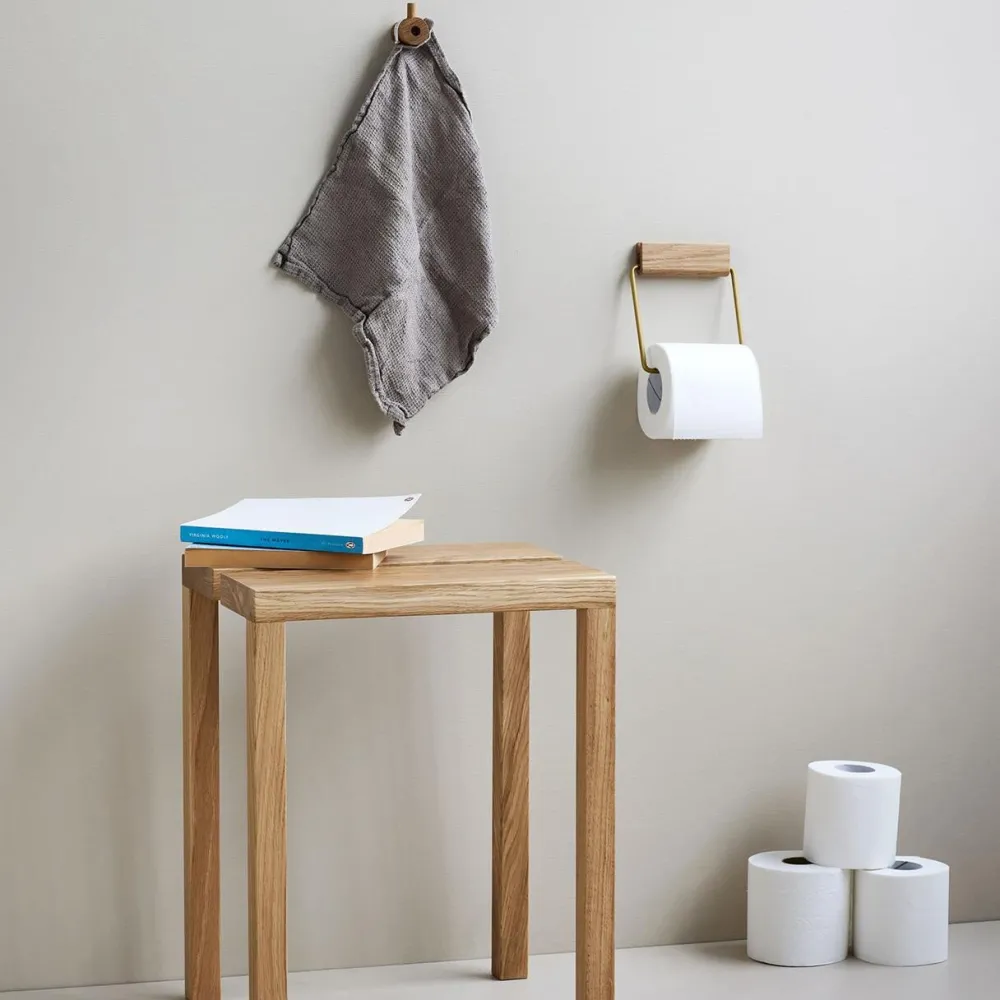 Stilren og dekorativ toiletrulleholder, der fuldender badeværelset. Træbeslaget fastgøres til væggen, mens metaltråden – som er dannet af to dele – holder papiret på plads. Egetræet er behandlet med en vandbaseret lak, således den er ideel til brug i fugtige omgivelser.