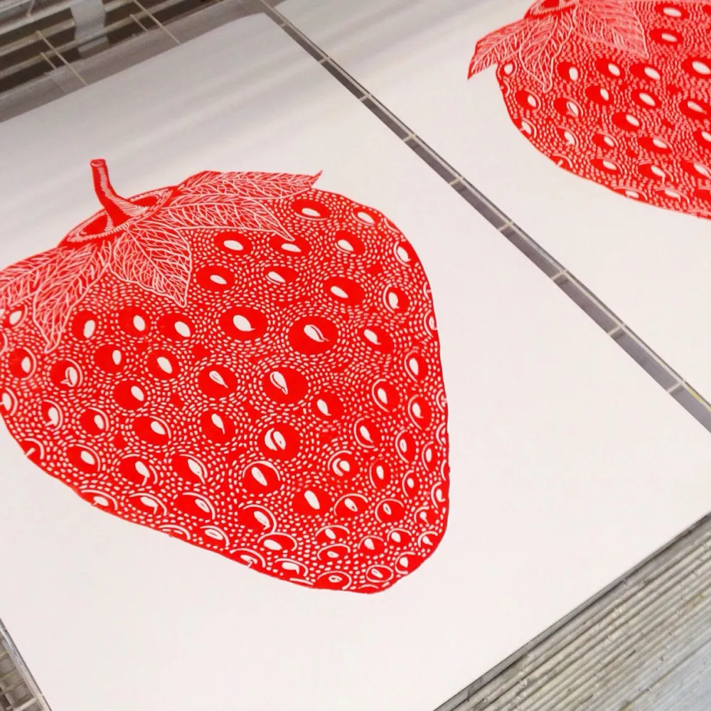 Enkelt og farvestrålende plakat, der med sin smukke, kontrasterende farvenuance og fascinerende detaljer, skildrer et jordbær. Linoleumstrykket er udført i hånden, hvorfor der kan forekomme afvigelser i farvetætheden. Foruden dette er hvert kunsttryk signeret og dateret af Monika Petersen.