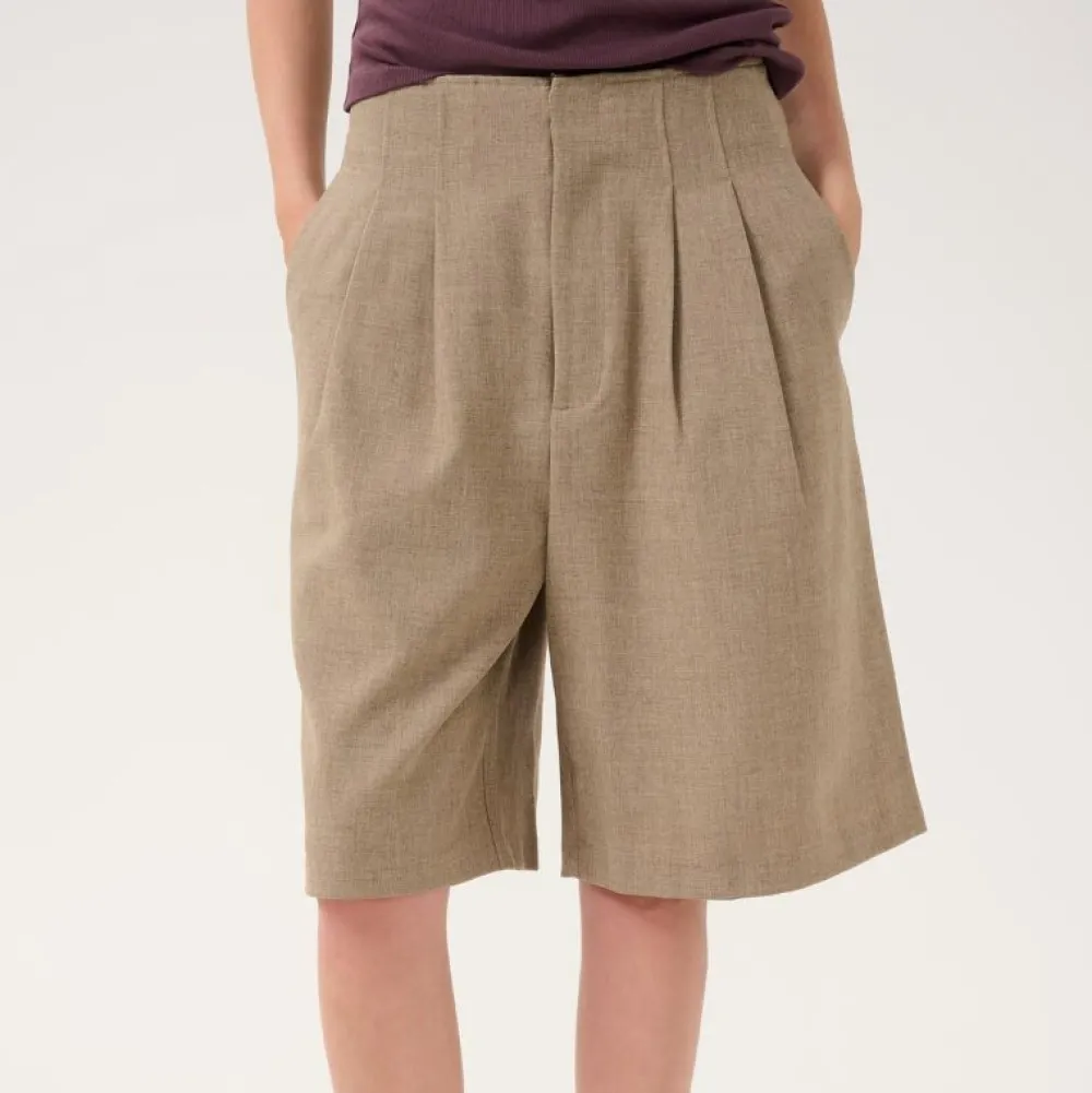 Disse shorts i Sepia Tint Melange har en løs pasform og en høj talje med elegante læg foran, som skaber en struktureret, men afslappet silhuet. Den over-knælange længde gør dem alsidige og moderne – ideelle til både kontorbrug og afslappede sommerdage.