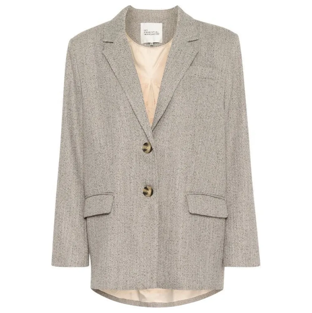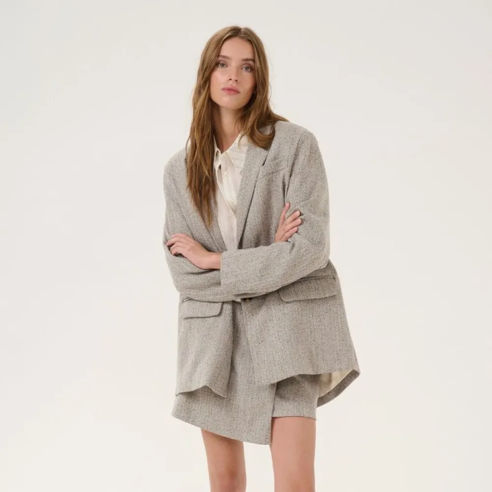 Emmy-blazeren har en struktureret silhuet med klassisk reverskrave, klaplommer og dobbeltradet knaplukning foran. Den A-formede pasform og hoftekorte længde giver et moderne og flatterende udtryk, mens de let vatterede skuldre og det forlængede bagstykke skaber en skarp, velklædt silhuet – perfekt til lag-på-lag styling.