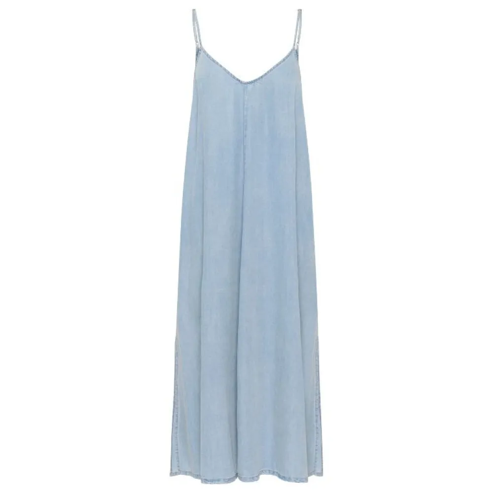 Giv din sommergarderobe et let og feminint løft med denne stilrene kjole i farven Light Blue Wash. Kjolen har en elegant A-formet pasform, der falder flot og skaber en luftig silhuet, perfekt til varme dage. Den lange længde og det ærmeløse design gør den ideel til både afslappede hverdagslooks og mere stilfulde sommeranledninger.