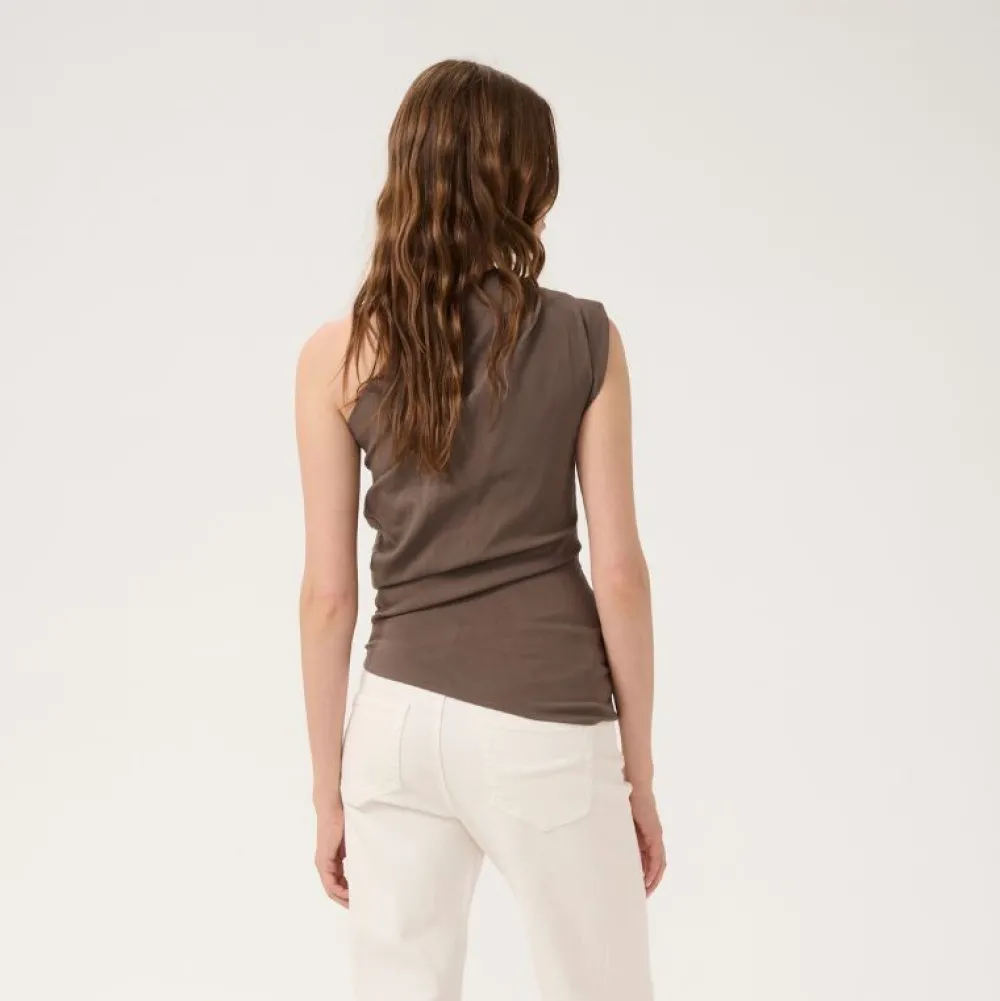 Denne ærmeløse top i farven Major Brown har en moderne, asymmetrisk halsudskæring og diskrete rynkedetaljer i siden, som skaber en flatterende og feminin silhuet. Toppen er designet i en blød og strækbar kvalitet med LENZING™ ECOVERO™ viskose, nylon og elastan, hvilket giver en tæt og behagelig pasform med masser af bevægelighed.