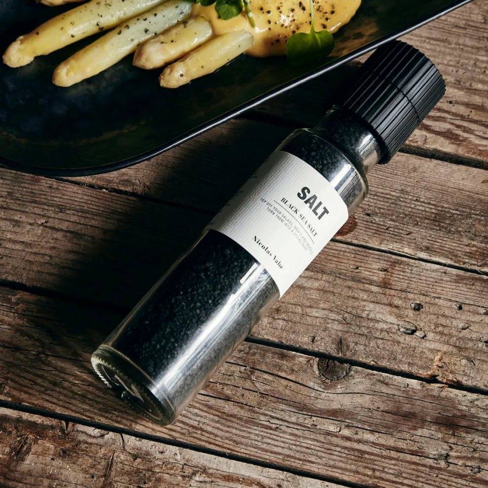 Velsmagende havsalt, som er blandet med aktivt kul, hvilket tilfører retterne et iøjenfaldende touch. Man spiser i høj grad med øjnene, hvorfor det samlede udtryk på retterne højnes med den dybe, sorte farve. Saltet gør madlavningen til en visuel fest og er særdeles velegnet til blødkogte æg, salater, kød og saucer. Saltet leveres med en keramisk kværn, som fint formaler krydderierne, således at olierne og dermed mere aroma og smag frigives til retterne.