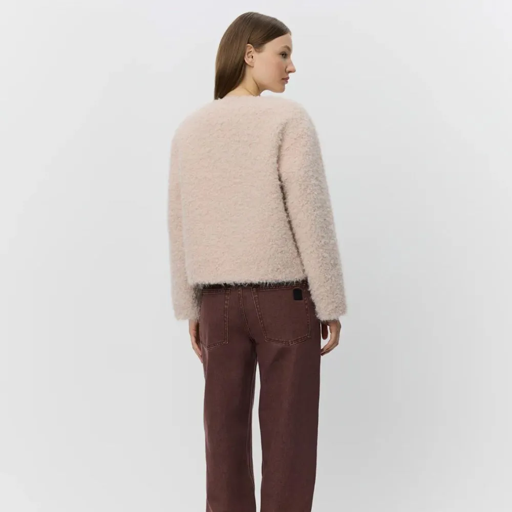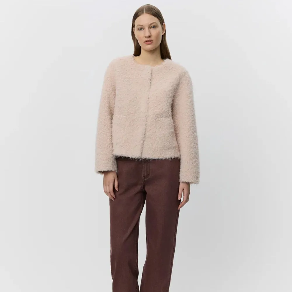 Feminin og raffineret jakke, der på fineste vis forener blød elegance og moderne charme. Jakken er udført i faux fur, som har et eksklusivt udtryk. Den runde hals med dekorative PU-syninger giver jakken et unikt præg, mens de skjulte trykknapper sørger for en elegant og diskret lukning. Med to praktiske lommer og et enkelt, sofistikeret udtryk er denne jakke ideel til at løfte både hverdagsgarderoben og mere festlige outfits. Et stilfuldt statement, der forener komfort, varme og luksuriøs lethed.
