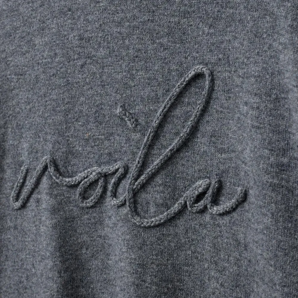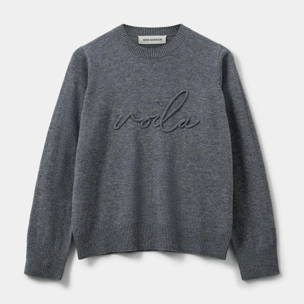 Minimalistisk, men med attitude – en gråmeleret klassiker med moderne finesse. Det enkle design kombineres med et afslappet, men velklædt fit, der giver et tidløst udtryk. Den runde hals og de ribstrikkede kanter fremhæver sweaterens rene linjer, mens det subtile broderi med teksten “Voila” tilfører et sofistikeret, fransk-inspireret touch. Resultatet er en sweater, der balancerer ubesværet elegance med en legende detalje. En alsidig favorit, der nemt kan blive en fast del af garderoben.