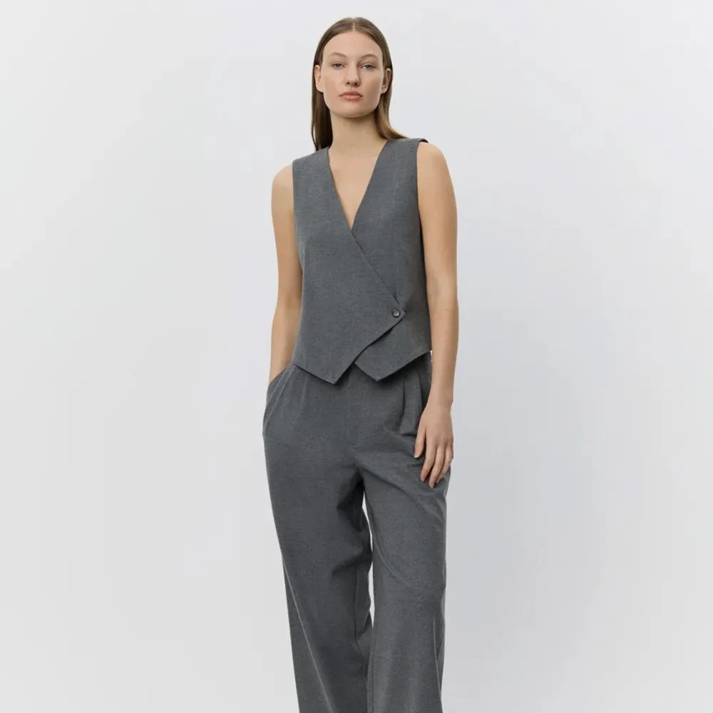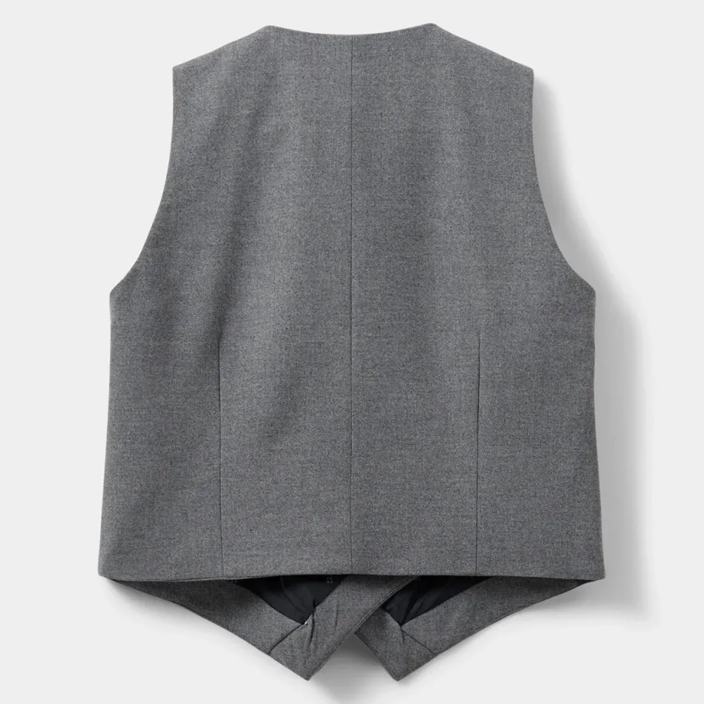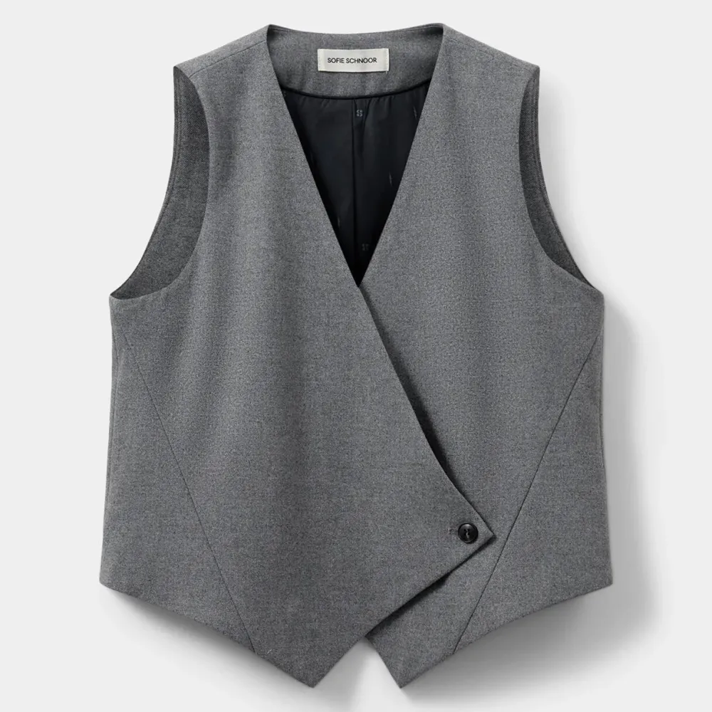 Enkel og tidløs vest, der tilføjer et sofistikeret lag til garderoben. Vestens slå-om detalje med knap- og trykknaplukning skaber både fleksibilitet og et stilfuldt udtryk, mens de asymmetriske overskæringer tilfører bevægelse og et grafisk element. Resultatet er en vest, der både er praktisk, alsidig og yderst fashionabel.