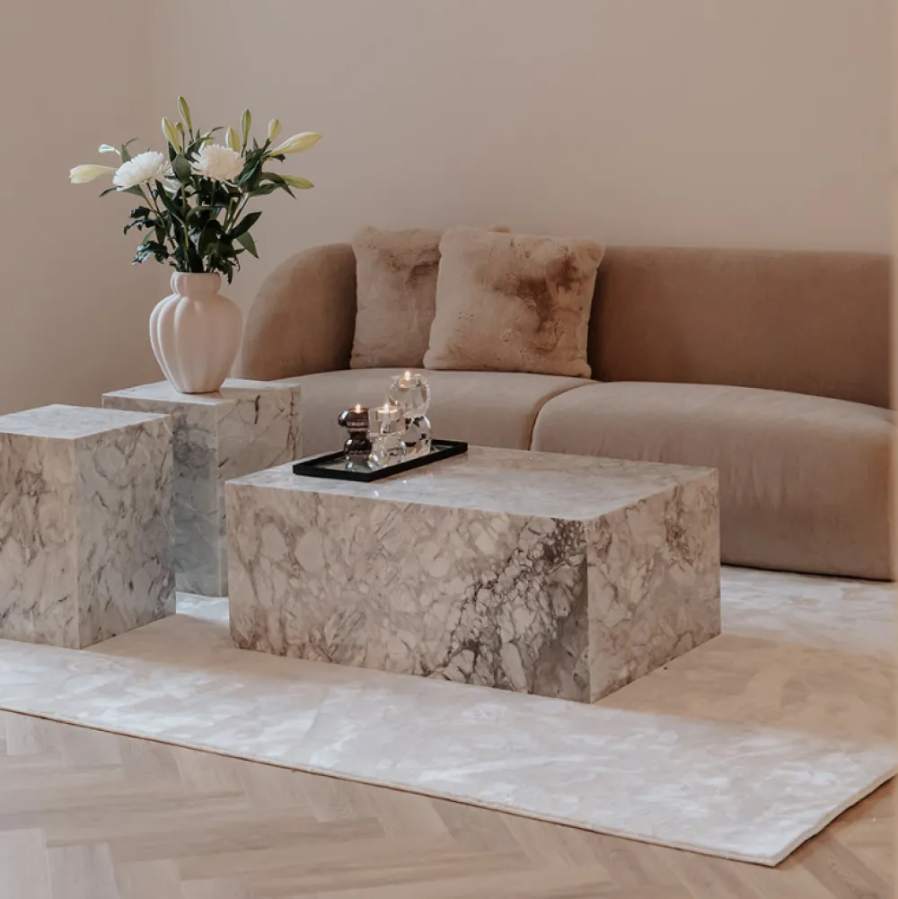 Smuk kombination af moderne og tidsløst. Phantom cube er et eksklusivt sofabord, hvor hvert bord er helt unikt. Marmordesignet er skabt over millioner af år i naturen, derfor har samtlige borde sin egne enestående særpræg i både farve og mønster. Sofabordet er åben i bunden og derfor ikke justerbar.