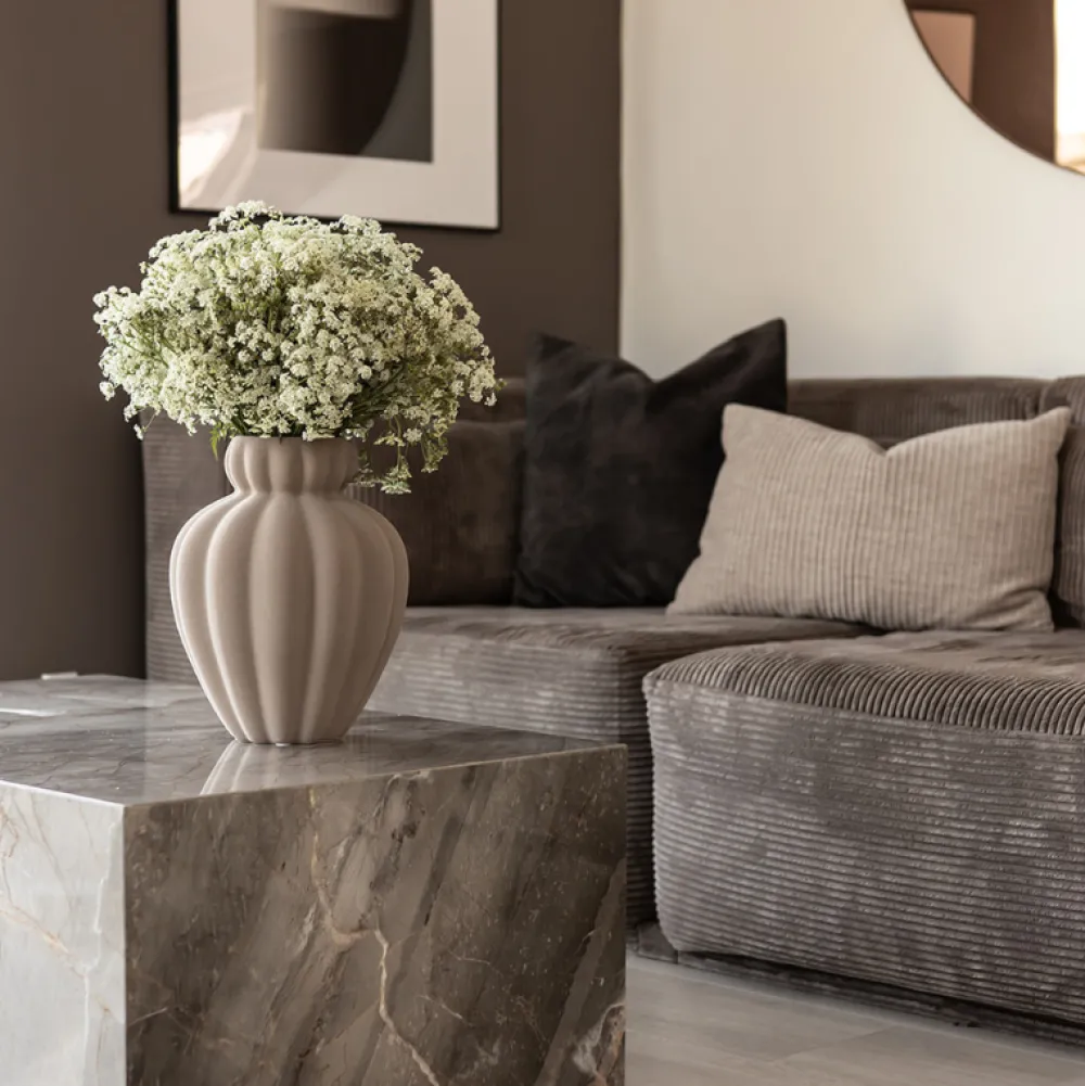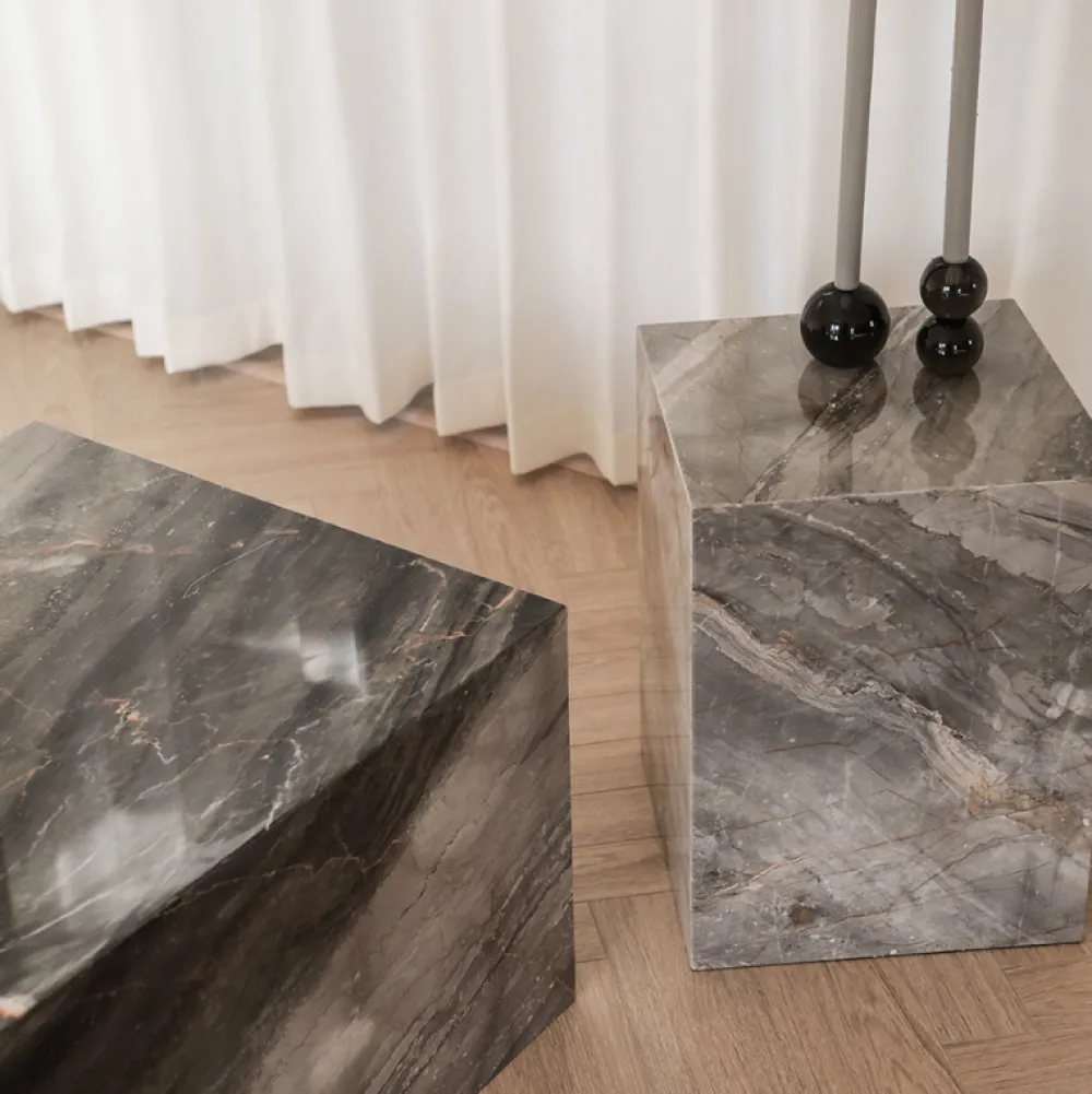 Smuk kombination af moderne og tidsløst. Phantom cube er et eksklusivt sofabord, hvor hvert design er helt unikt. Marmordesignet er skabt over millioner af år i naturen, derfor har samtlige borde sin egne enestående særpræg i både farve og mønster. Sofabordet er åben i bunden og derfor ikke justerbar.