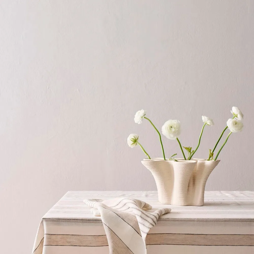 Naturinspireret vase, formet med bløde kurver og en bred, flad profil, der henter sin æstetik fra de rolige linjer i en fjord. Vasen er 3D-printet i porcelænsler, hvilket muliggør de præcise linjer og de intrikate detaljer, der kendetegner designet – former så delikate, at de ville være næsten umulige at opnå i traditionelt håndværk.