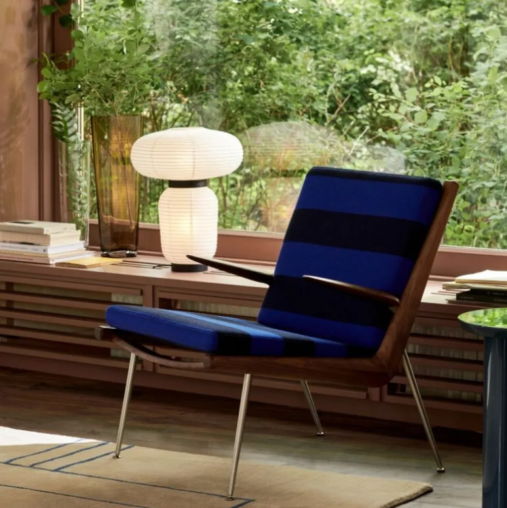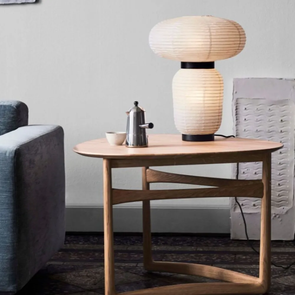 Håndlavet med rispapir, der blander forskellige størrelser og former sammen. Serien består af tre forskellige lanterneversioner og en bordlampe i elfenben-hvidt papir med sortbejdset egedetaljer.