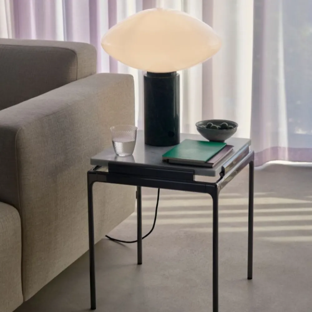 Mist bordlampen, lavet af mundblæst opalglas, har en tyk marmorsøjle med en lille lysdæmperkontakt. Kontrasten mellem glassets lette form og marmorens soliditet skaber et elegant design rigt på materialitet.