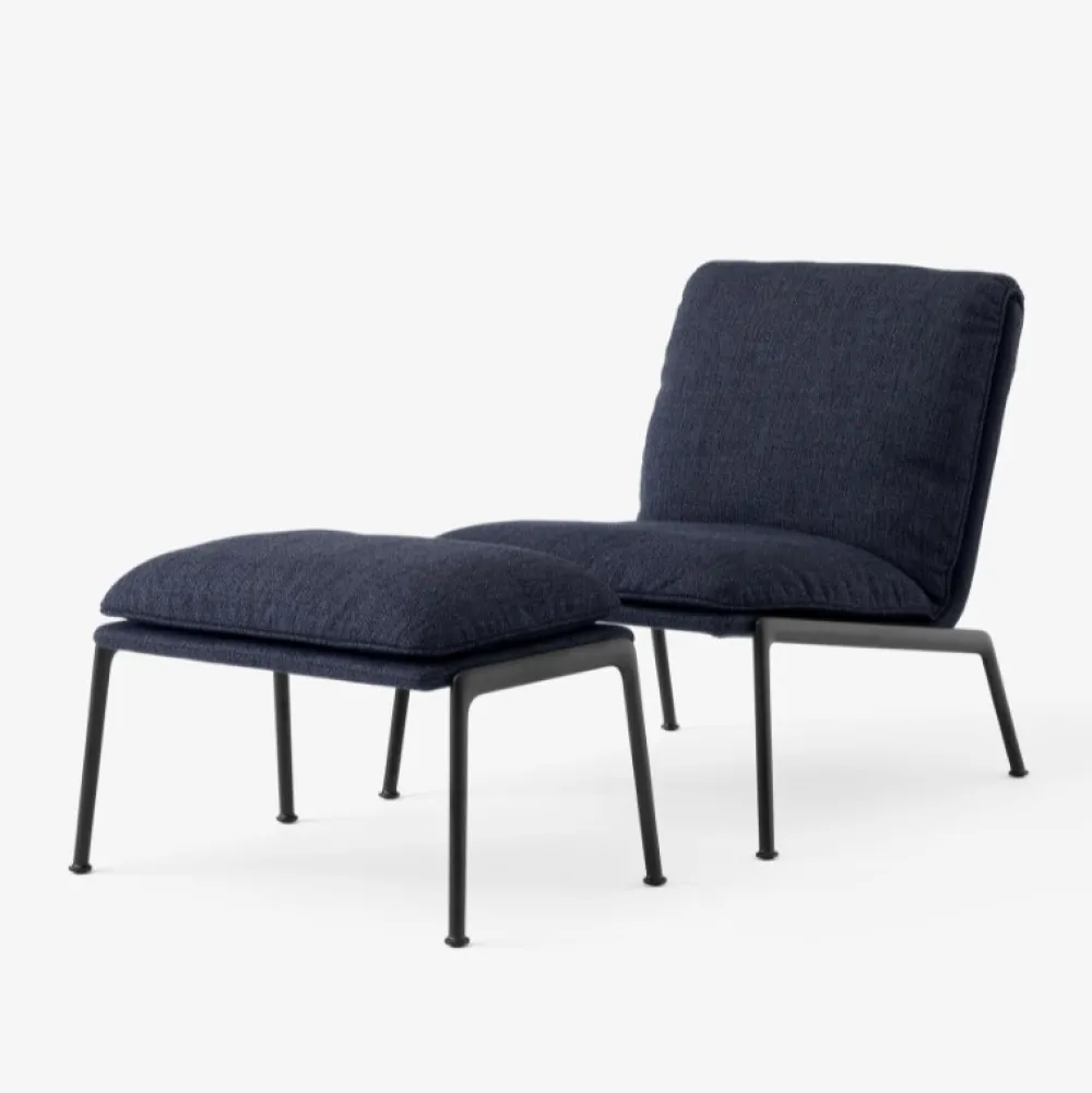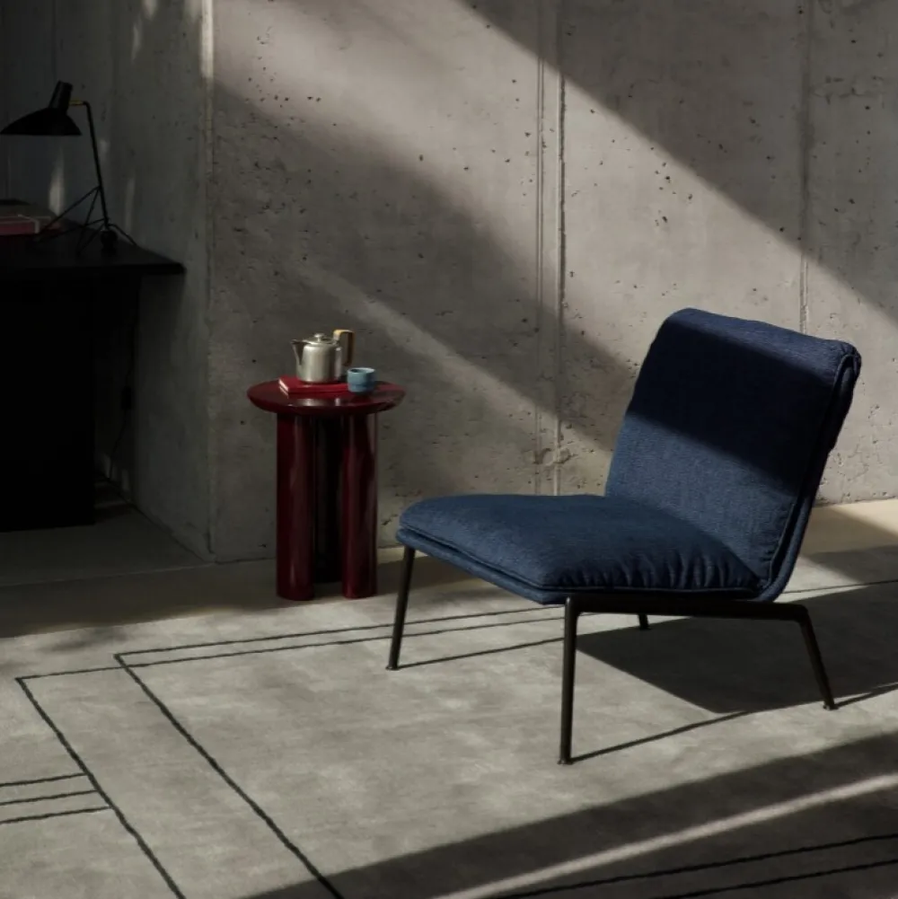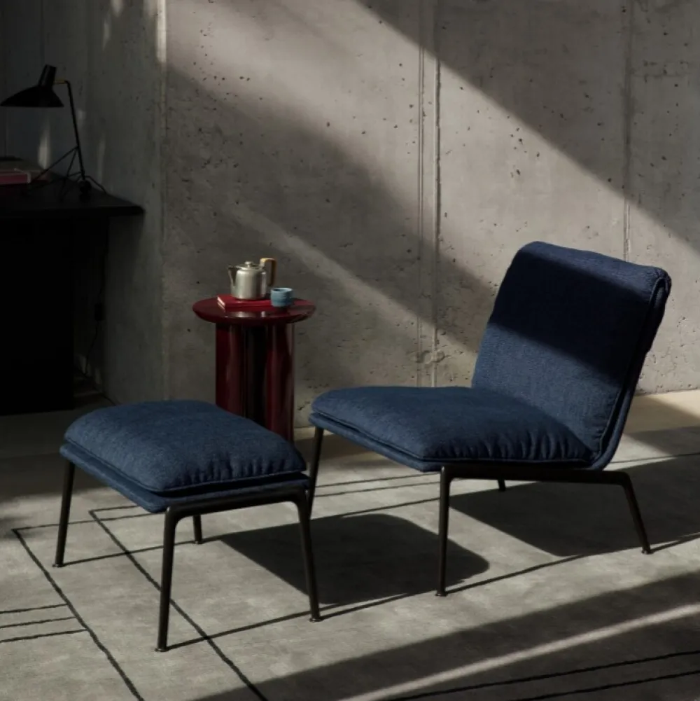 Kendetegnet ved sine plyspuder og slanke, støbte aluminiumsben, tilbyder Muno loungestolen den samme overbevisende oplevelse som sin højere modstykke i en mere kompakt form. Ved at have en enkelt hynde ser stolens sæde og ryglæn ud, som om den var draperet over stellet for at opnå et afslappet, men elegant udtryk.