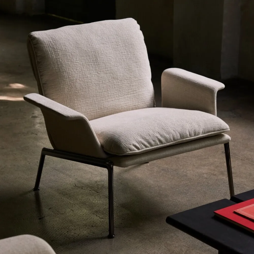 Kendetegnet ved sine plyspuder og slanke, støbte aluminiumsben, tilbyder Muno loungestolen den samme overbevisende oplevelse som sin højere modstykke i en mere kompakt form. Ved at have en enkelt hynde ser stolens sæde og ryglæn ud, som om den var draperet over stellet for at opnå et afslappet, men elegant udtryk.