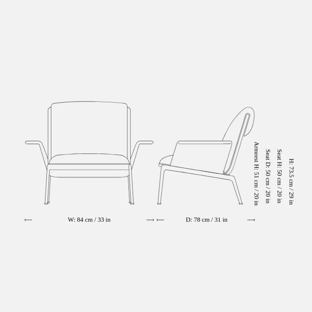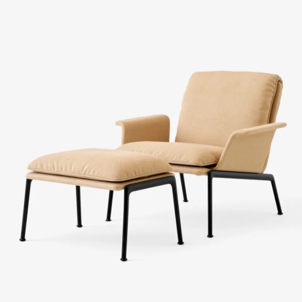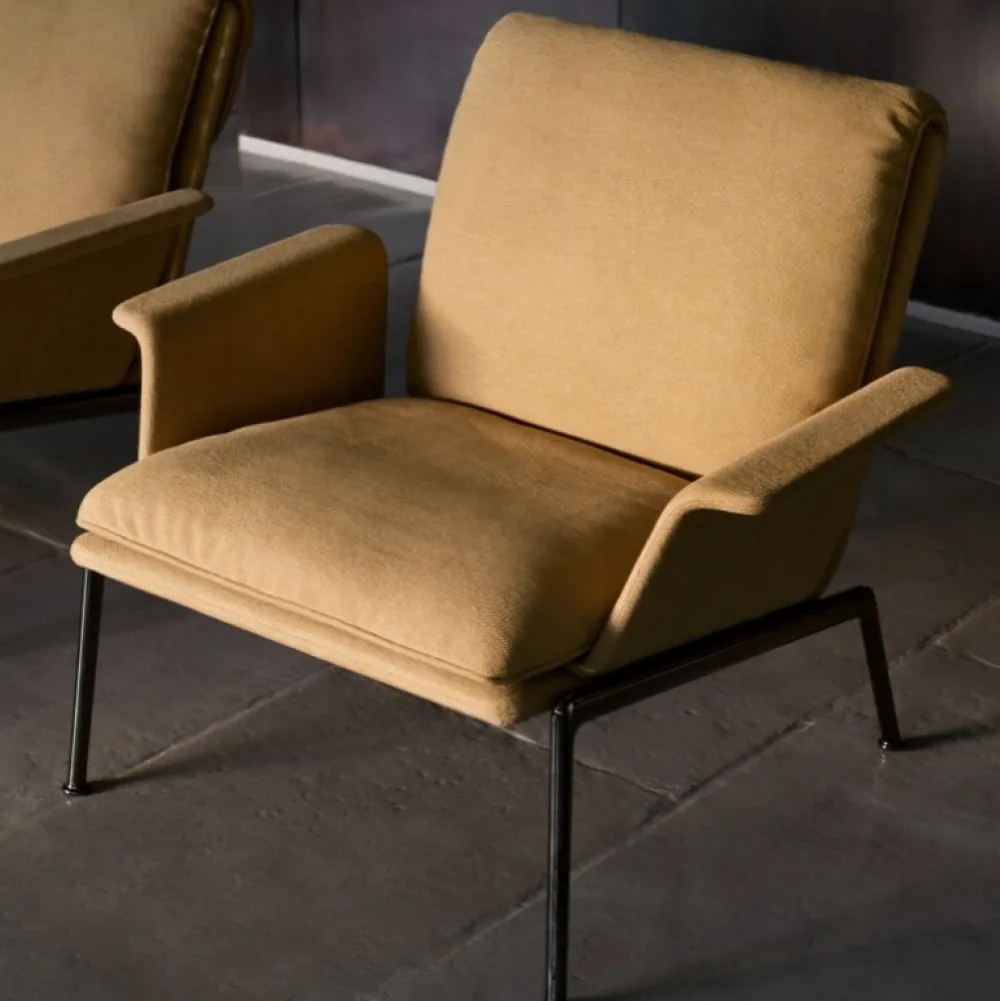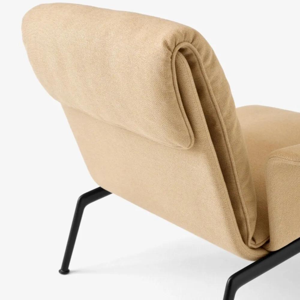 Kendetegnet ved sine plyspuder og slanke, støbte aluminiumsben, tilbyder Muno loungestolen den samme overbevisende oplevelse som sin højere modstykke i en mere kompakt form. Ved at have en enkelt hynde ser stolens sæde og ryglæn ud, som om den var draperet over stellet for at opnå et afslappet, men elegant udtryk.