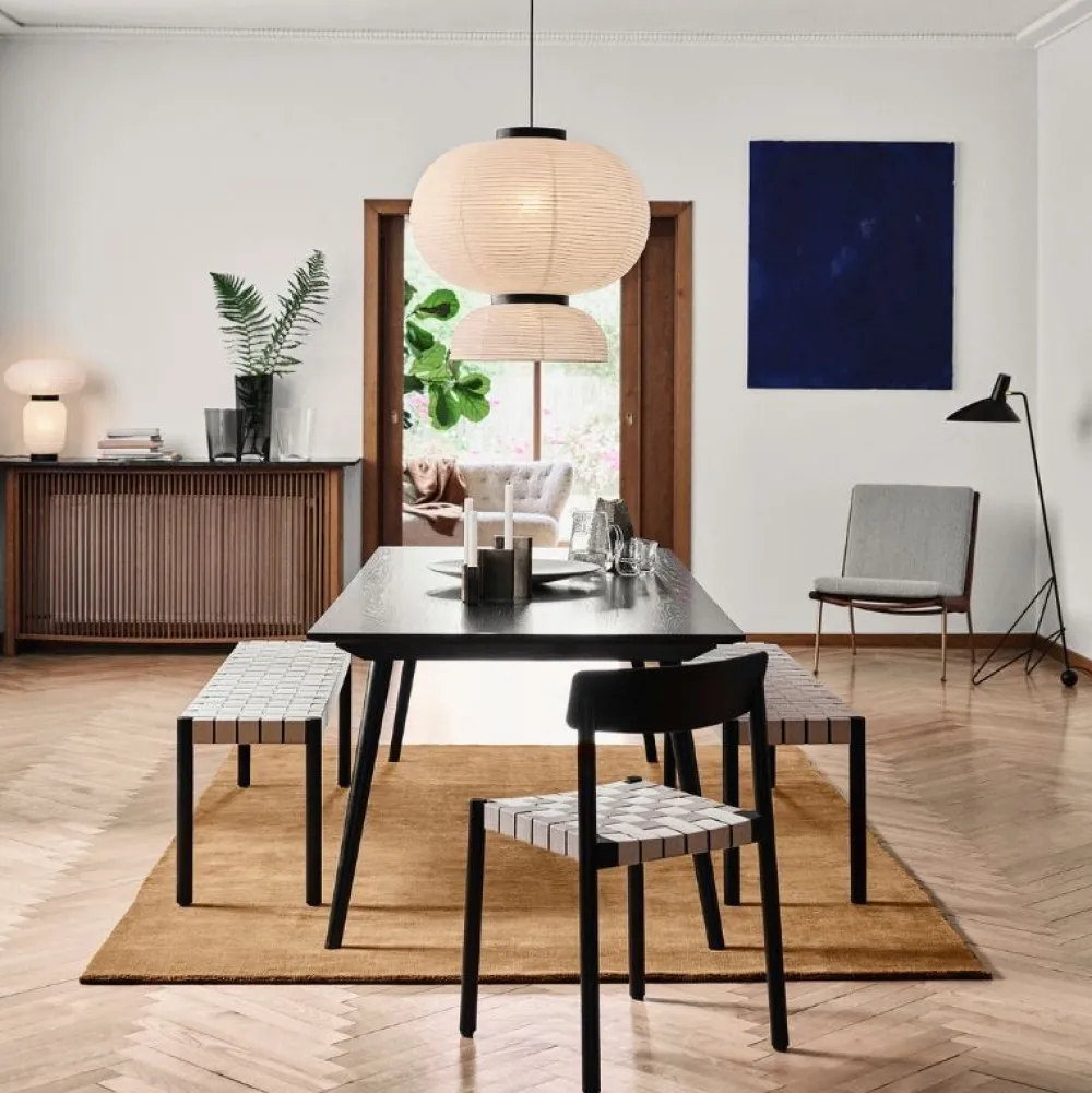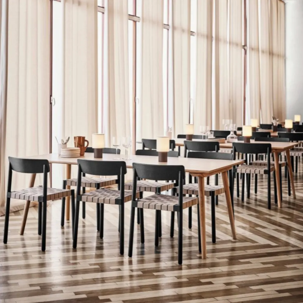 Materiale: Massivt træ, formpresset træfinér, naturligt hør og PP (polypropylen) bånd.