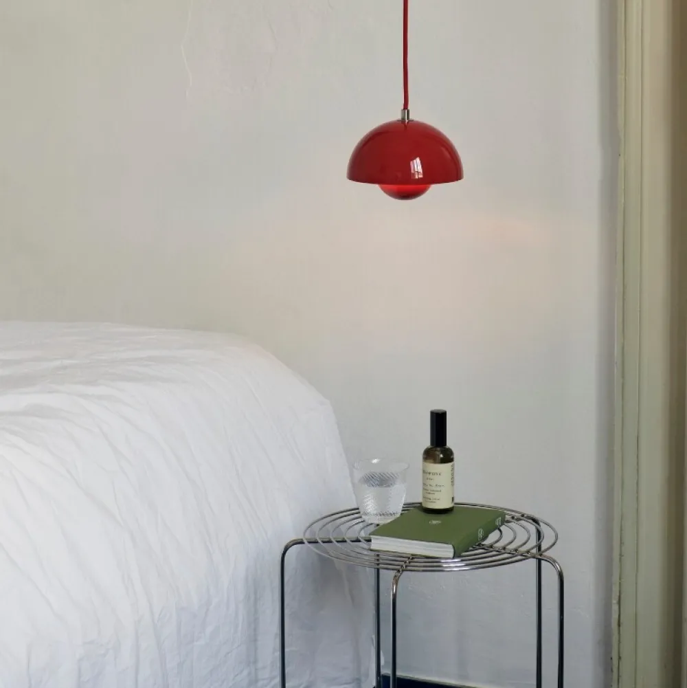 Det, der gør Wire Stool umiskendelig Verner Panton, er brugen af rustfrit ståltråd til at skabe en enkel geometrisk form med gentagne mønstre i en stabelbar skammel, der tilmed fungerer som et smukt sidebord.