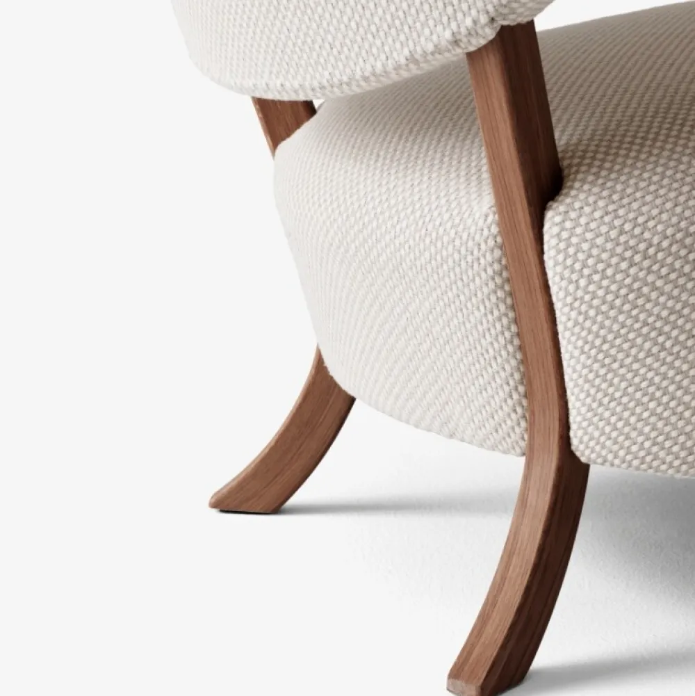 De markante, kurvede armlæn smelter smukt sammen med det brede, vingeformede ryglæn og skaber et arkitektonisk udtryk, der tilfører personlighed og raffinement til enhver indretning.