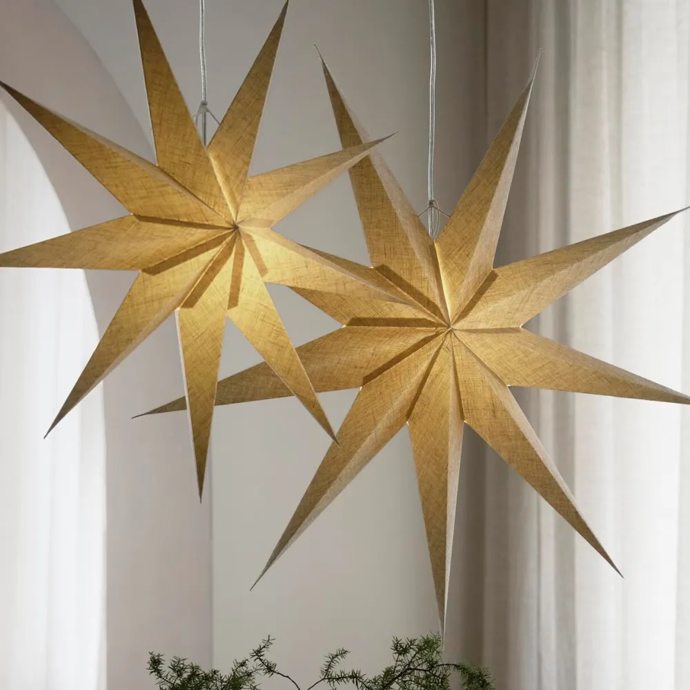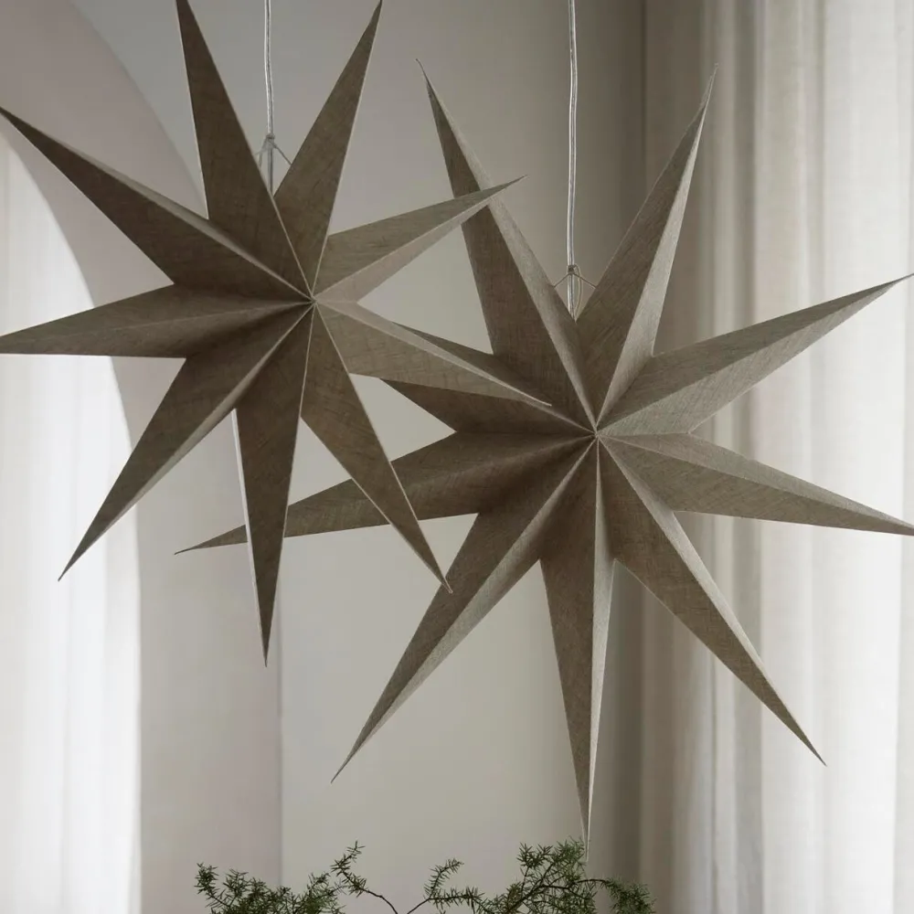 Med sit enkle og naturlige udtryk forener stjernen klassisk julestemning med moderne skandinavisk design. Adventsstjernen er håndfoldet i papir beklædt med naturfarvet hør og har ni elegante spidser, der giver et varmt og roligt lys. Den taktile overflade og rene form skaber en stemning af ro og raffinement – ideel til et hjem med sans for æstetik og enkelhed.