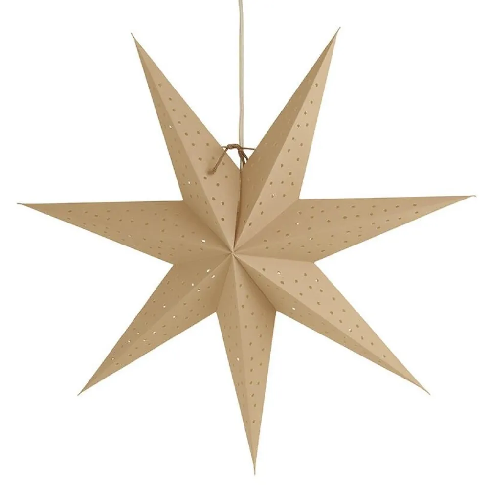 Smuk og klassisk papirstjerne, der som følge af det enkle snit er elegant. Stjernen er dekoreret med et mønster af små huller, der – ved indsættelse af lyskilde – resulterer i et magisk glimt, når den er tændt. Lad stjernen lyse op i vinduet og skab en stemningsfuld julestemning på de mørke vinteraftener. Stjernen foldes og bindes i hånden.