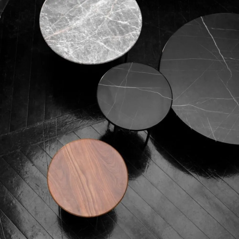 De små Floema-borde forener elegant geometriske former. Floema er lavet med bordplader i enten sort laminat, eksklusivt marmor eller massiv valnød for en førsteklasses håndfølelse. Bordet svæver på en let ramme af sort pulverlakeret stål.