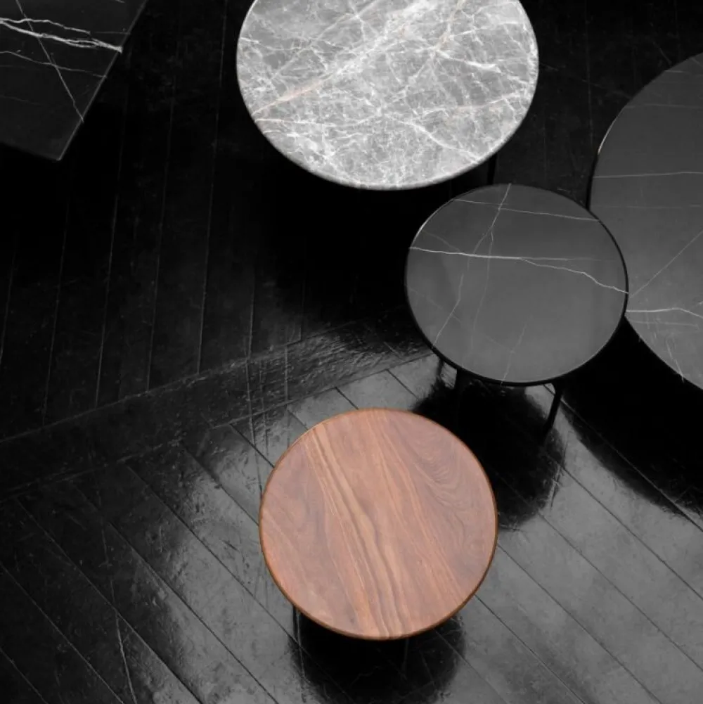 De små Floema-borde forener elegant geometriske former. Floema er lavet med bordplader i enten sort laminat, eksklusivt marmor eller massiv valnød for en førsteklasses håndfølelse. Bordet svæver på en let ramme af sort pulverlakeret stål.